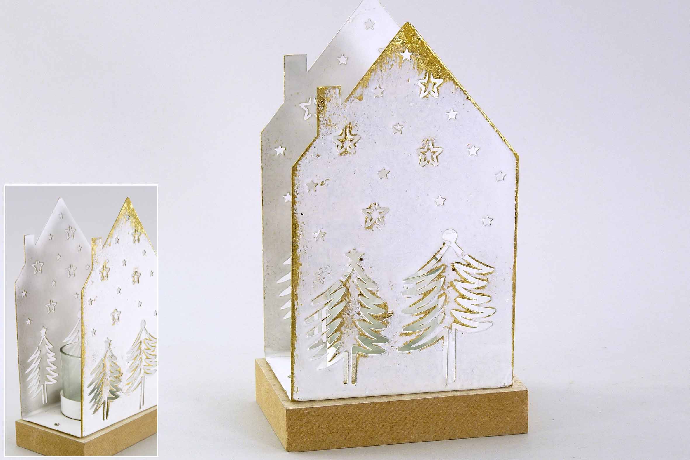 Metall/Holz-Haus Teelichthalter +Glas antik-weiß-gold H19 B11 T7cm