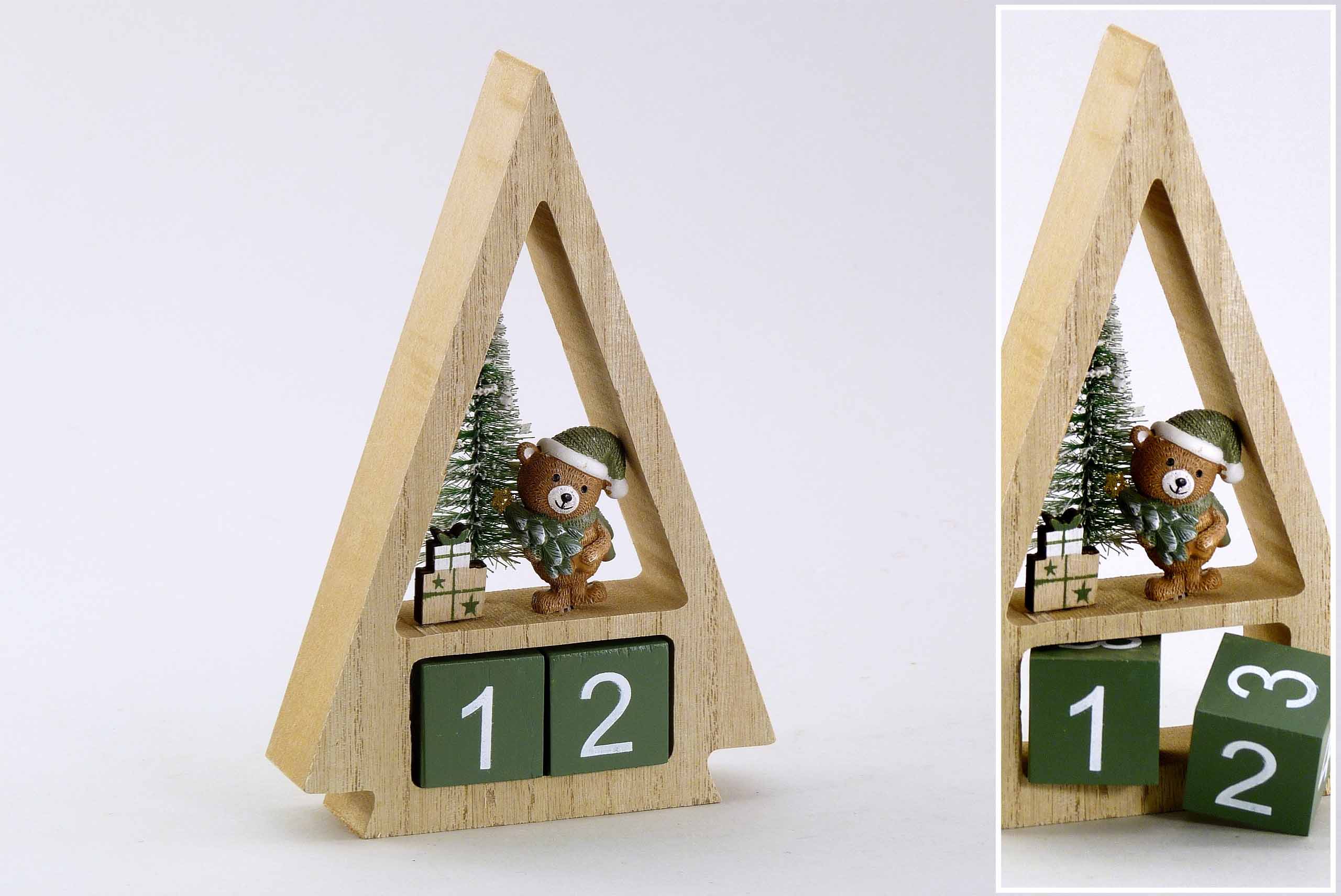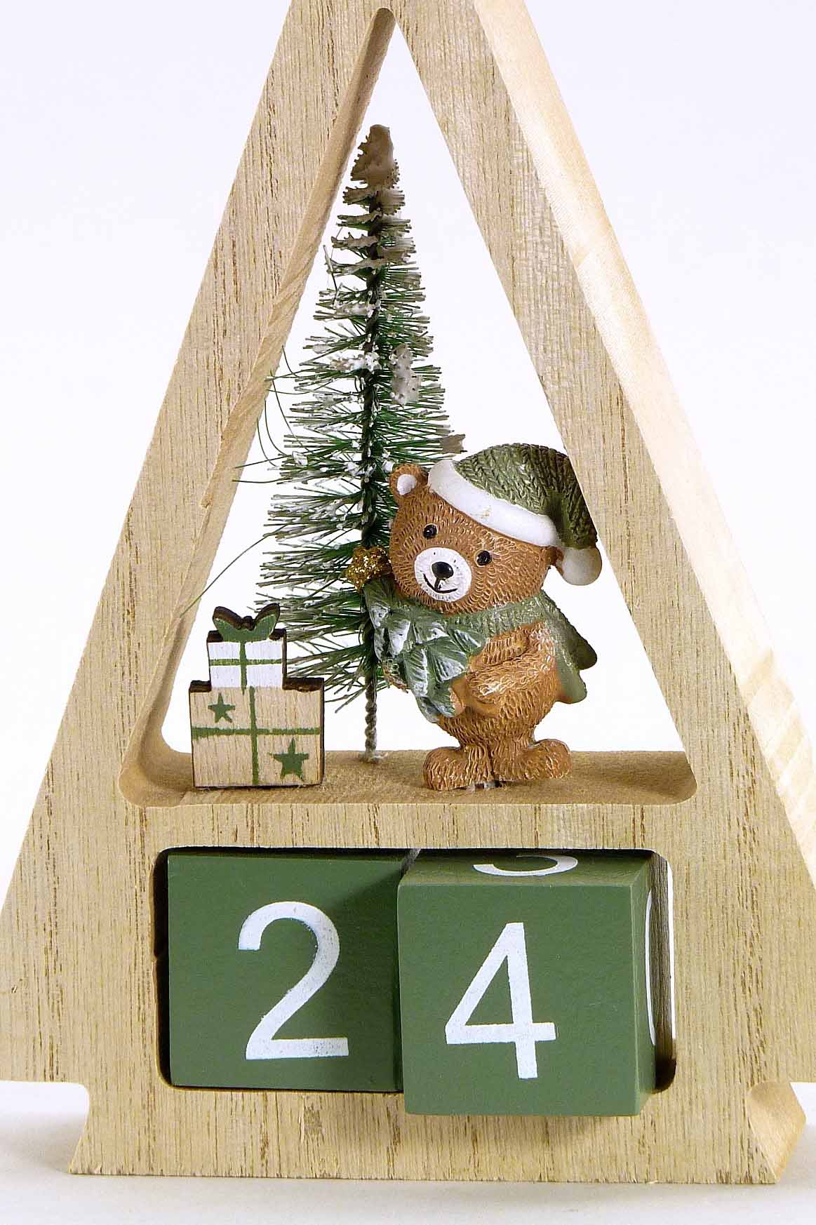 Holz-Adventkalender +Teddy natur-grün-weiß H18 B12cm