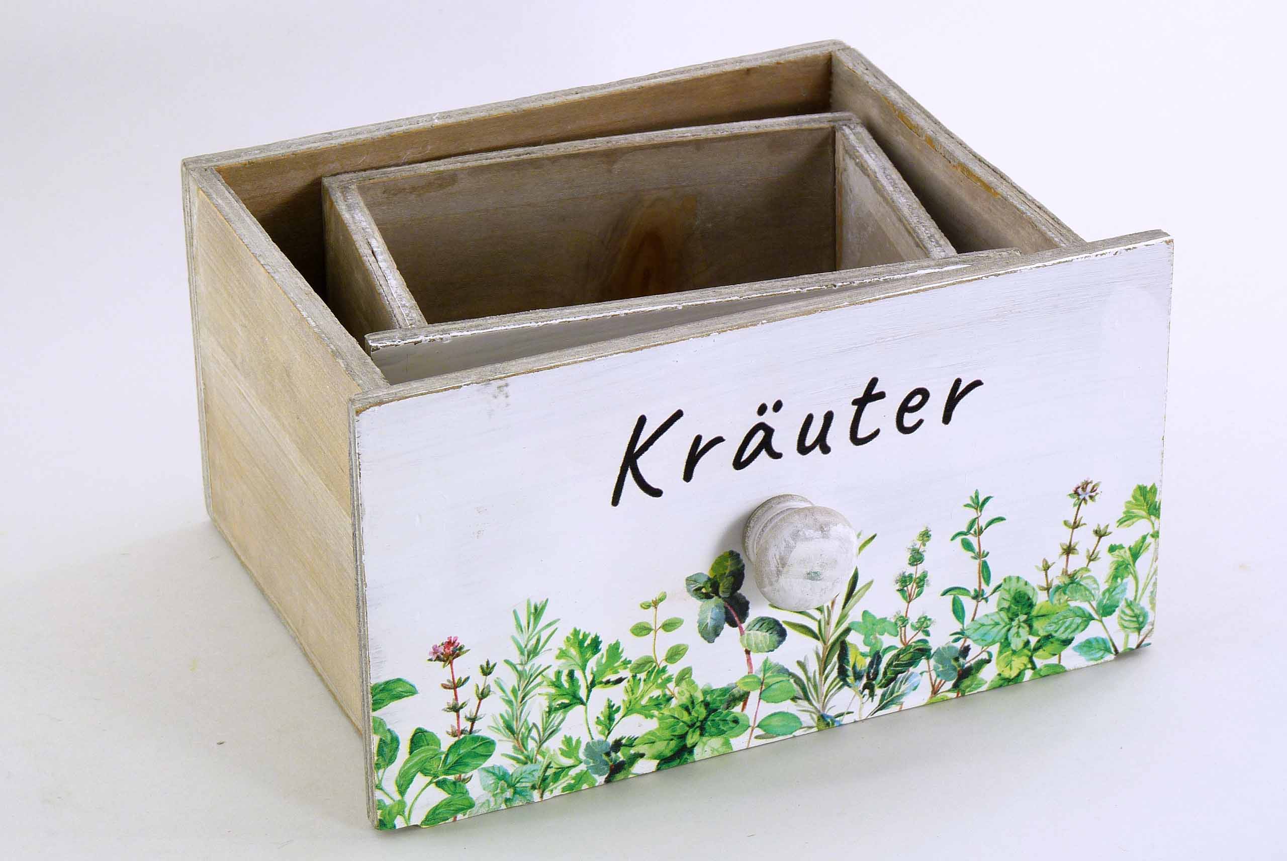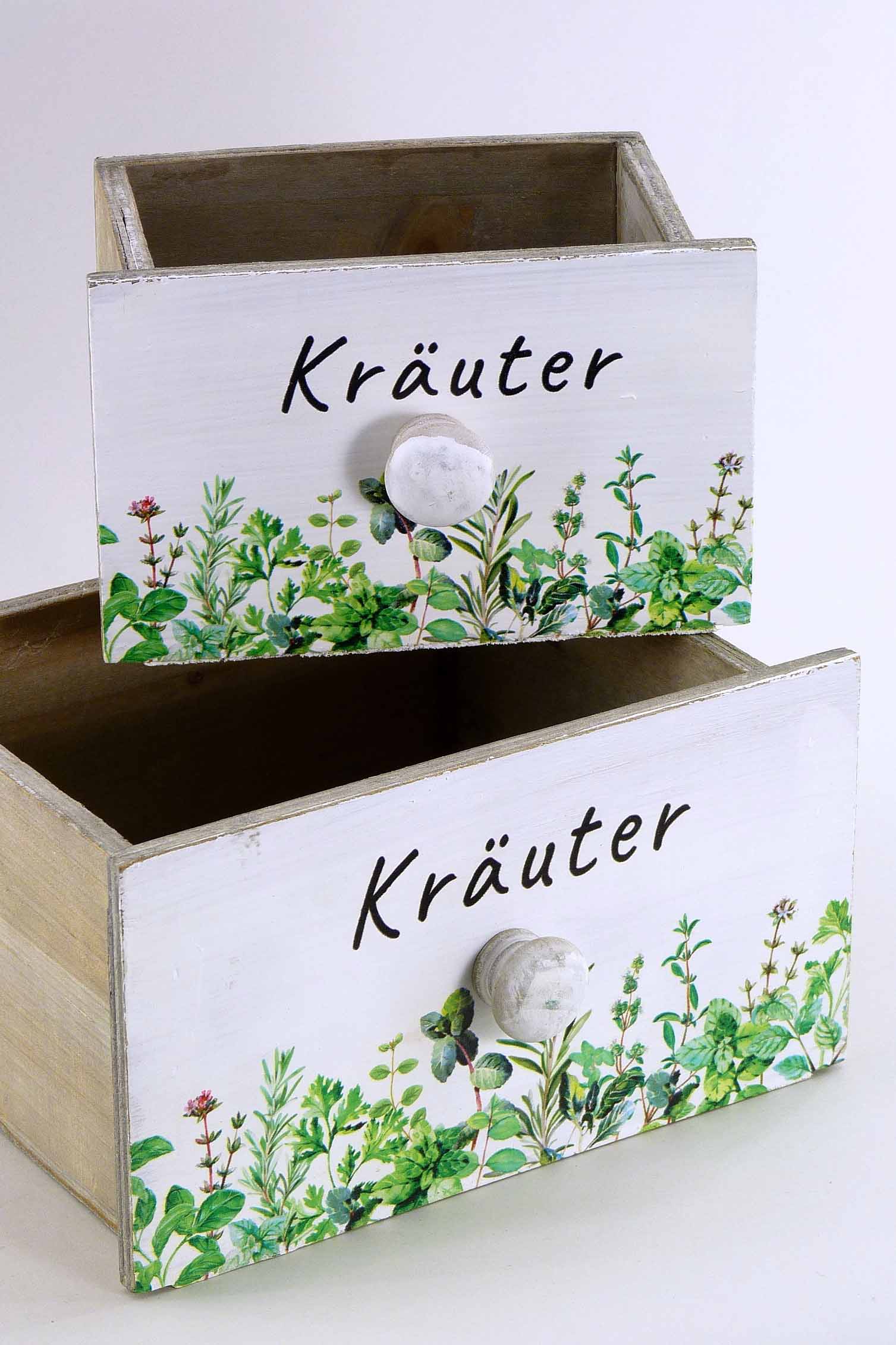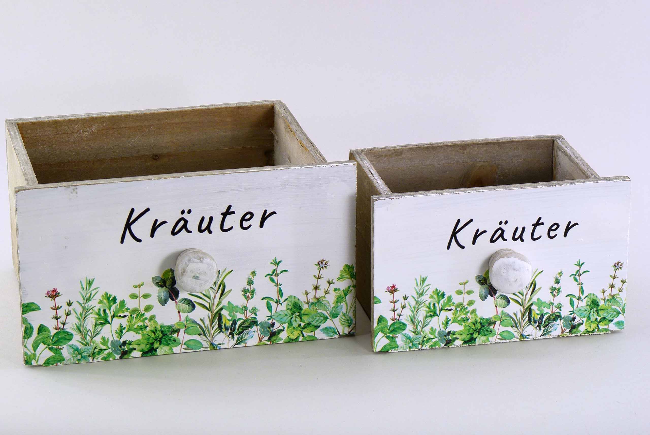 Holz-Lade ''Kräuter'' S/2 grau-weiß-grün 16,5x11 H10,5; 21x16,5 H11,5cm