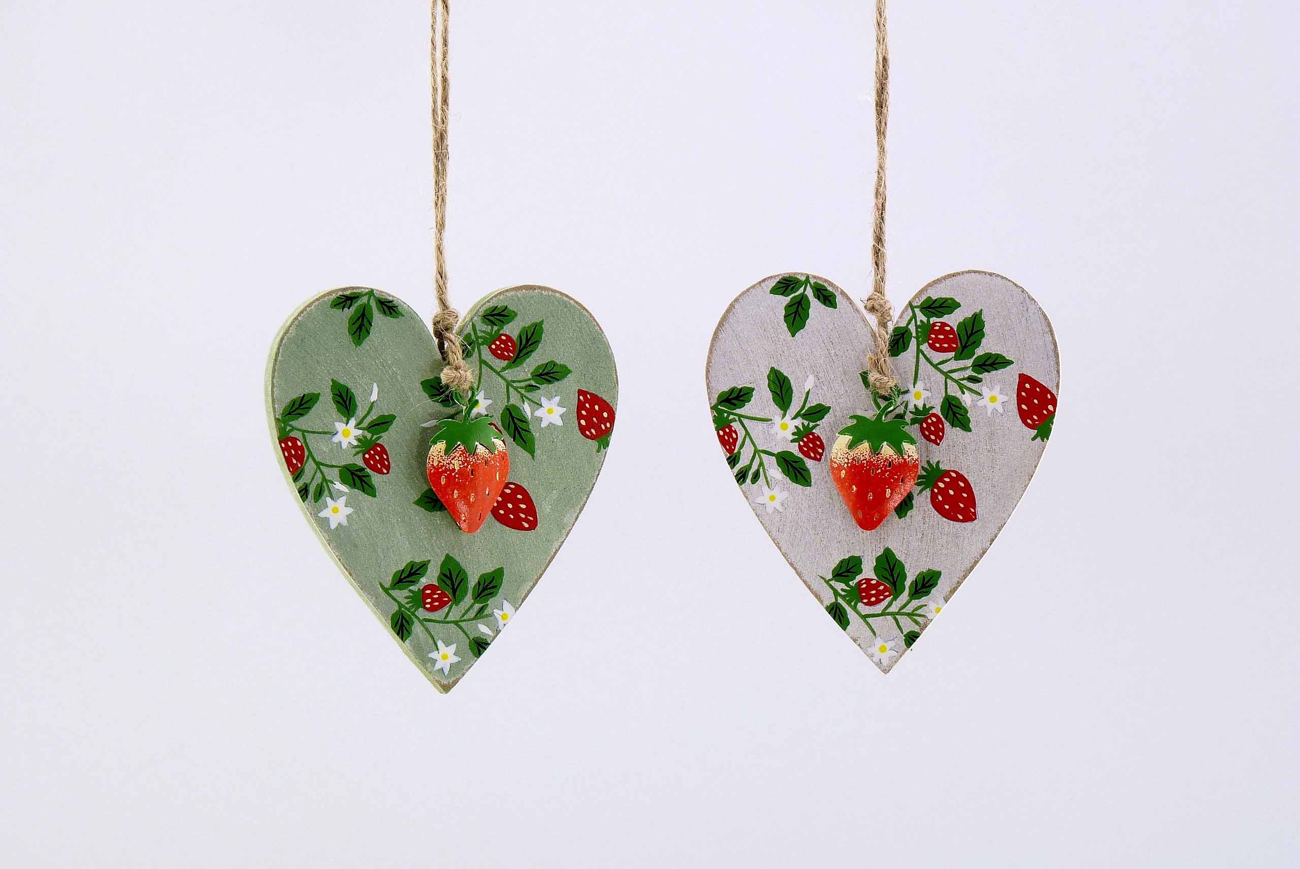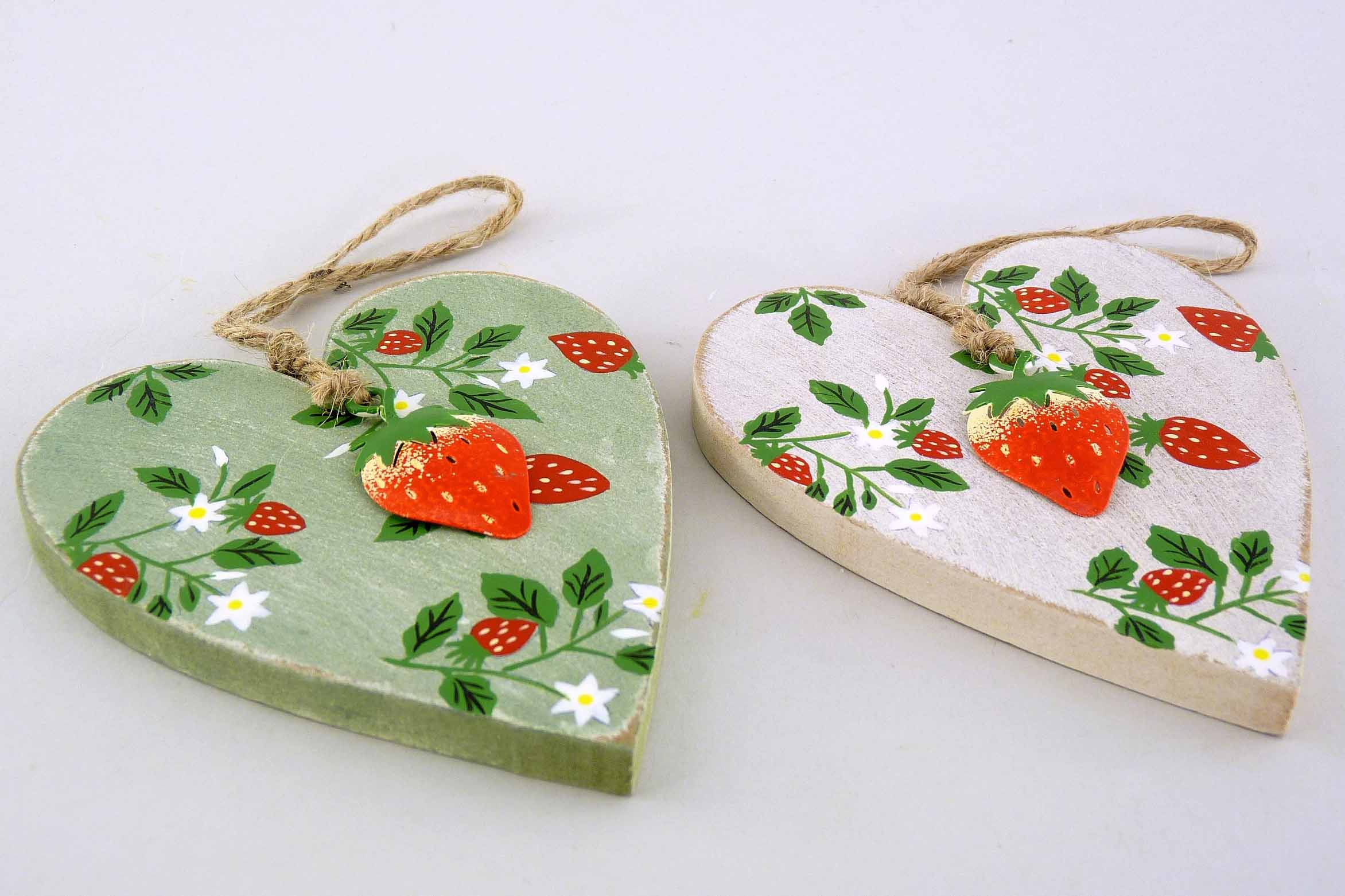 Holz-Herz ''Erdbeer-Dekor'' hgd. grün/weiß-rot sort. 10x9cm