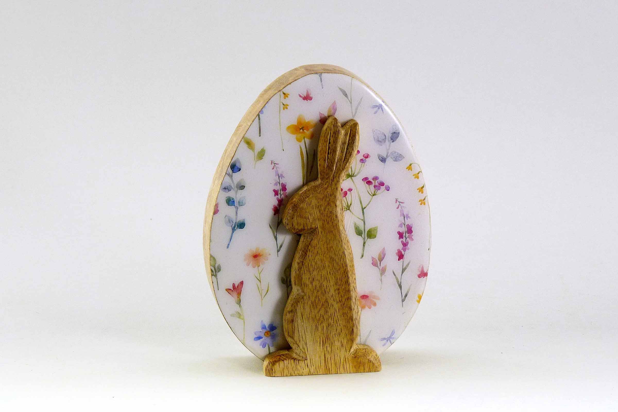 Mangoholz-Hase auf Ei ''Streublumen-Dekor'' natur-weiß-bunt H15cm
