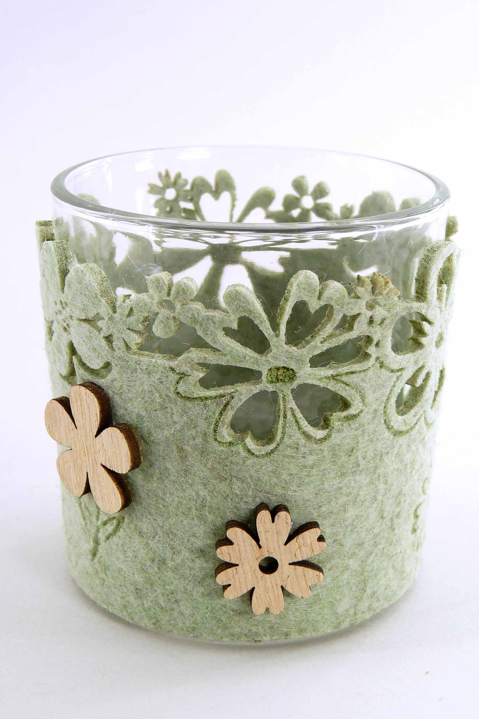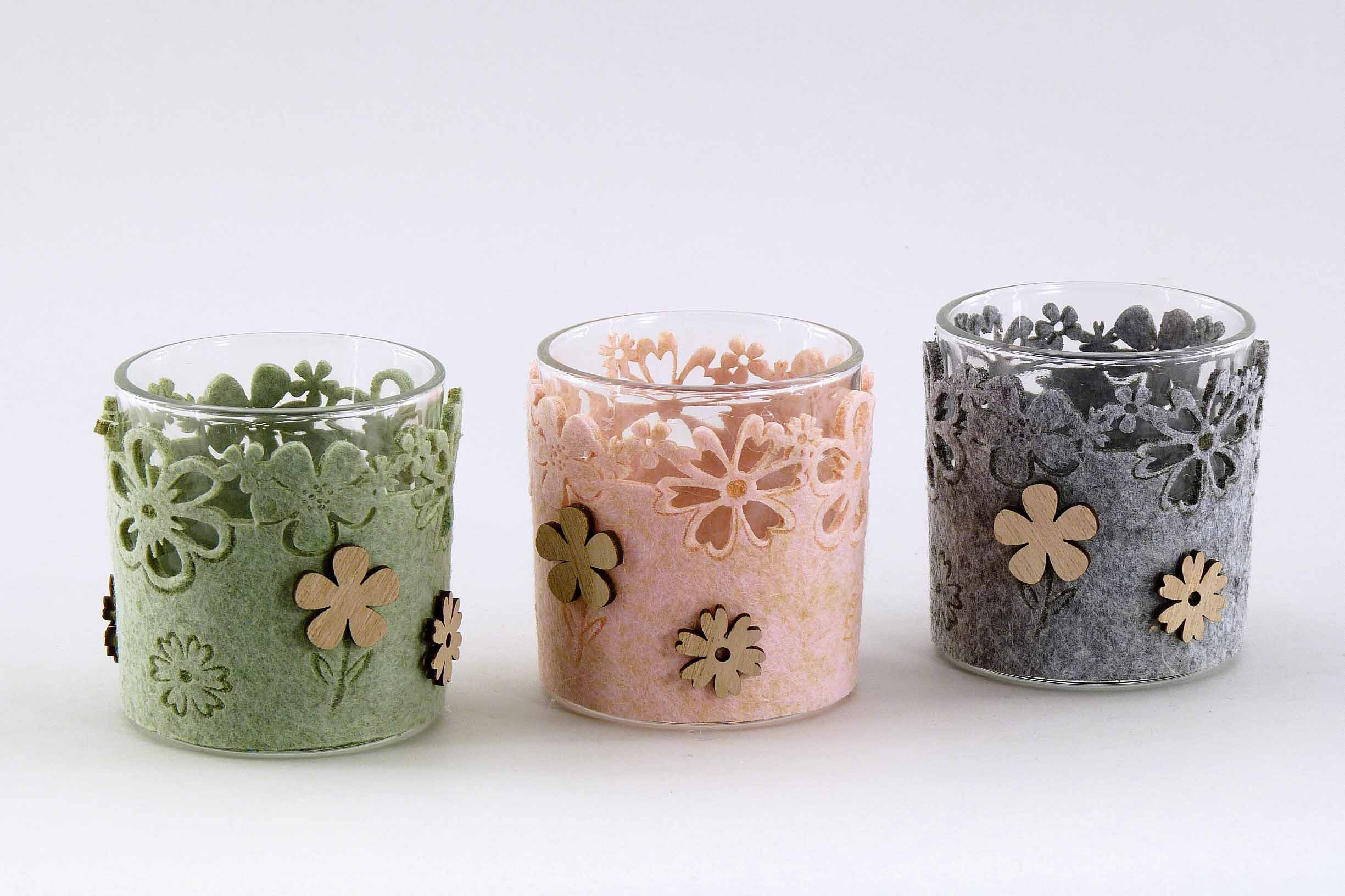 Filz/Holz-Teelichtglas ''Blümchen'' mint/rosa/grau sort. ø/H7,5cm