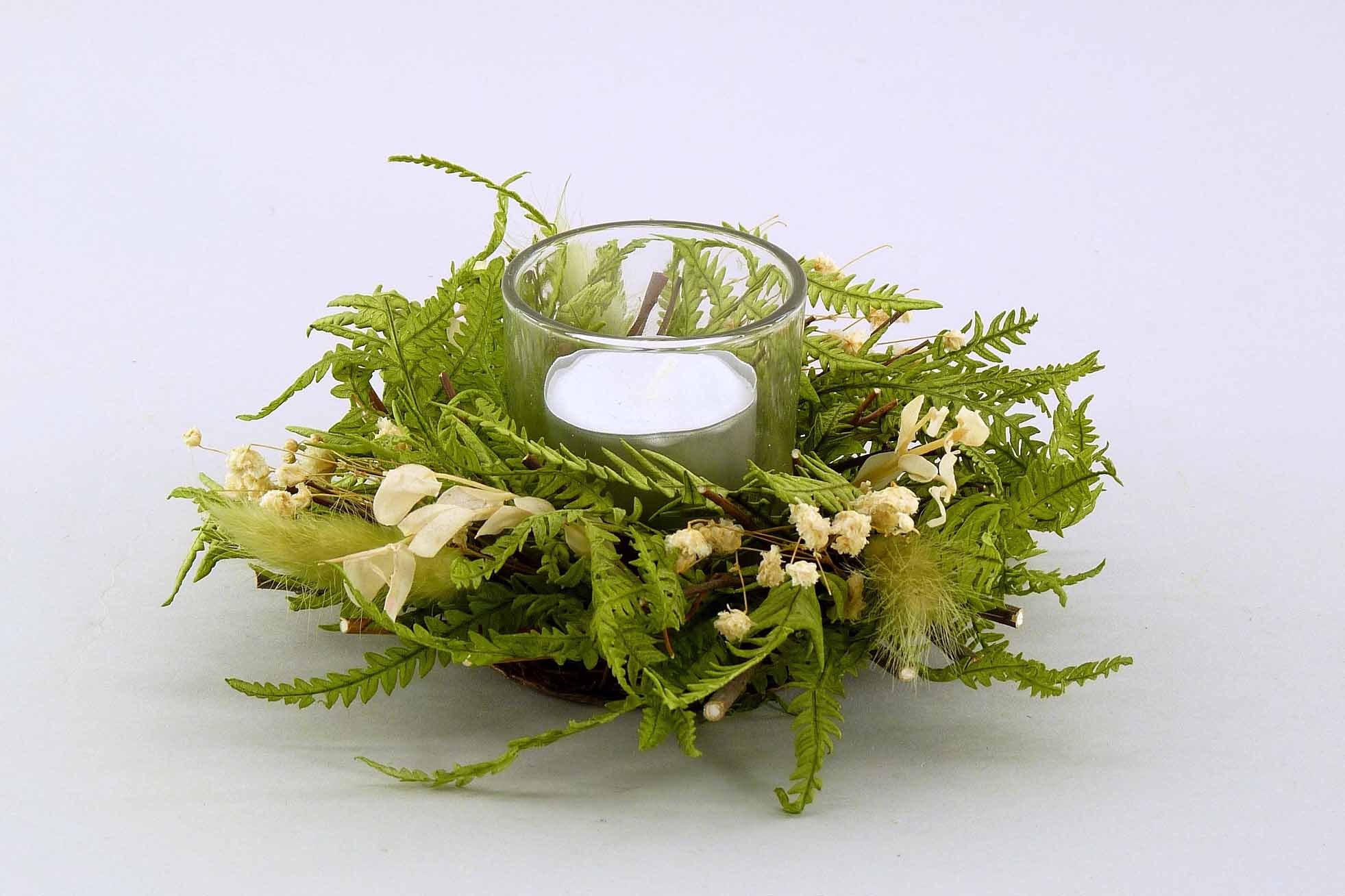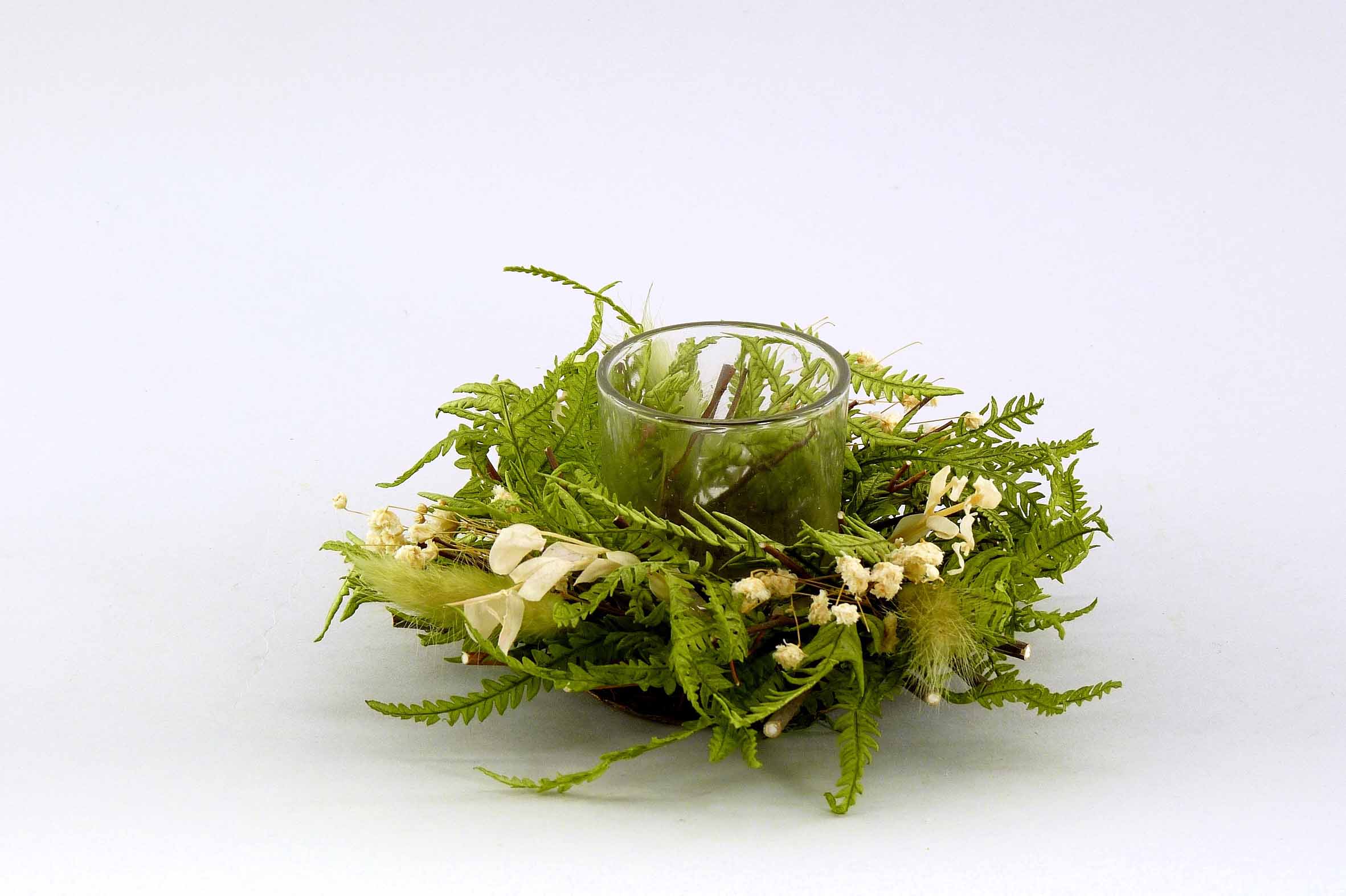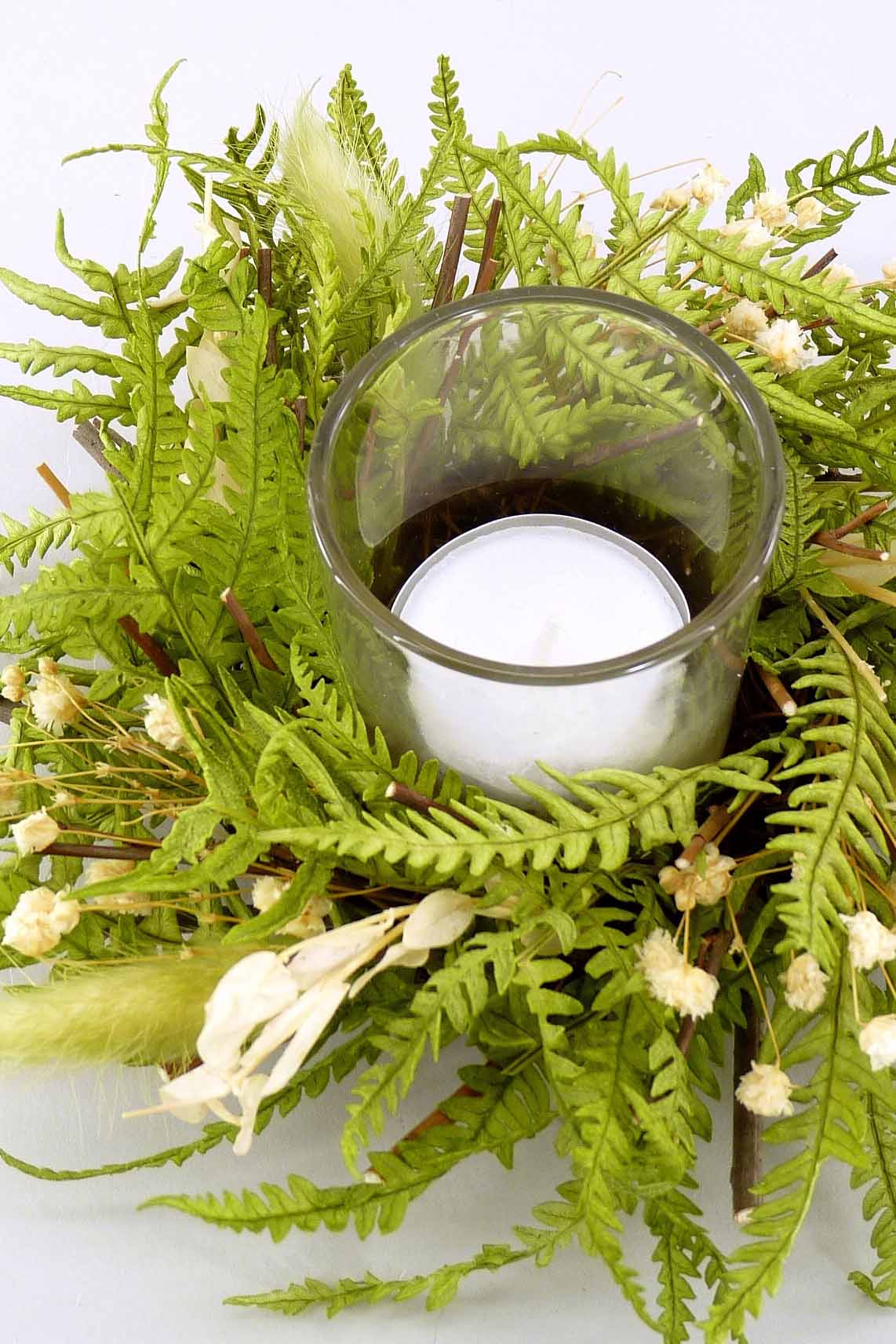 Glas-Windlicht mit Natur-Farn-Deko natur-grün-weiß ø15 H7cm