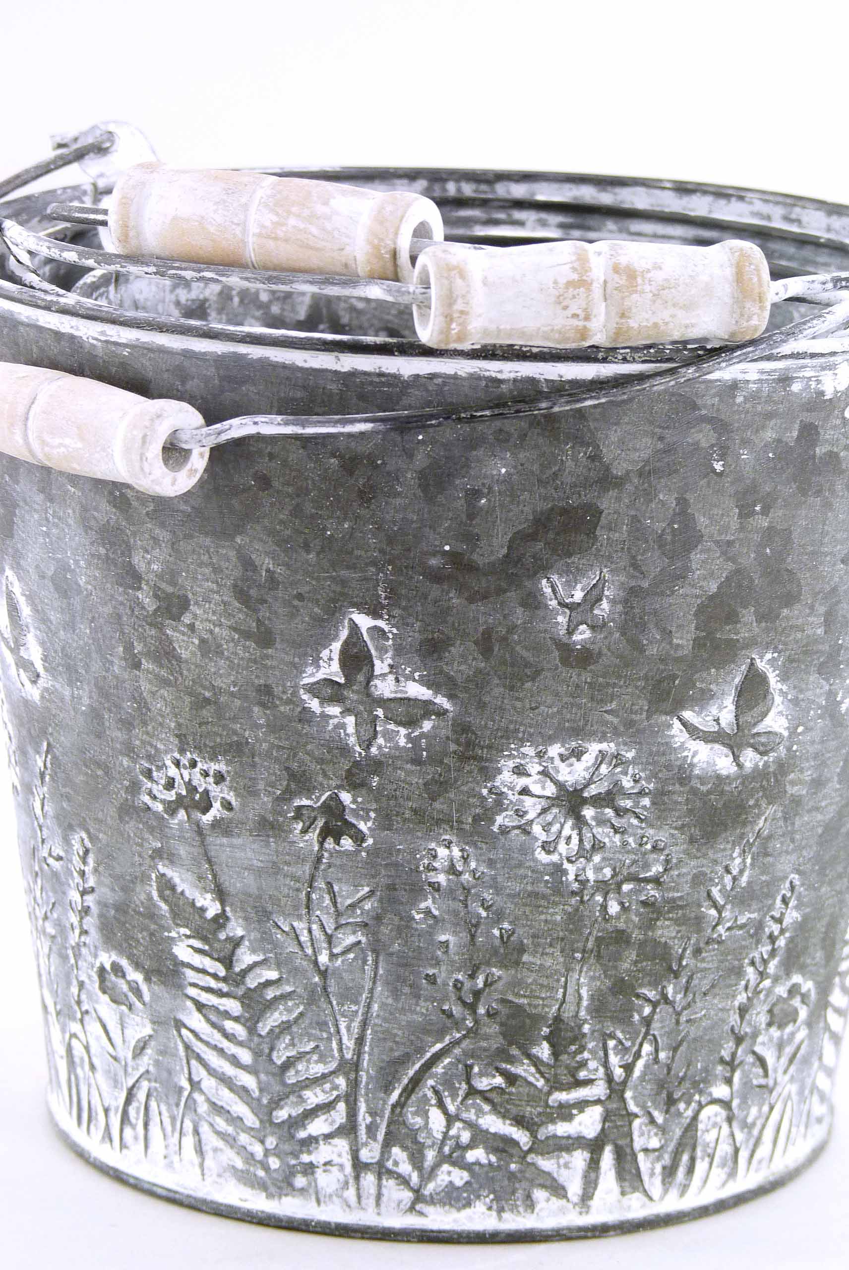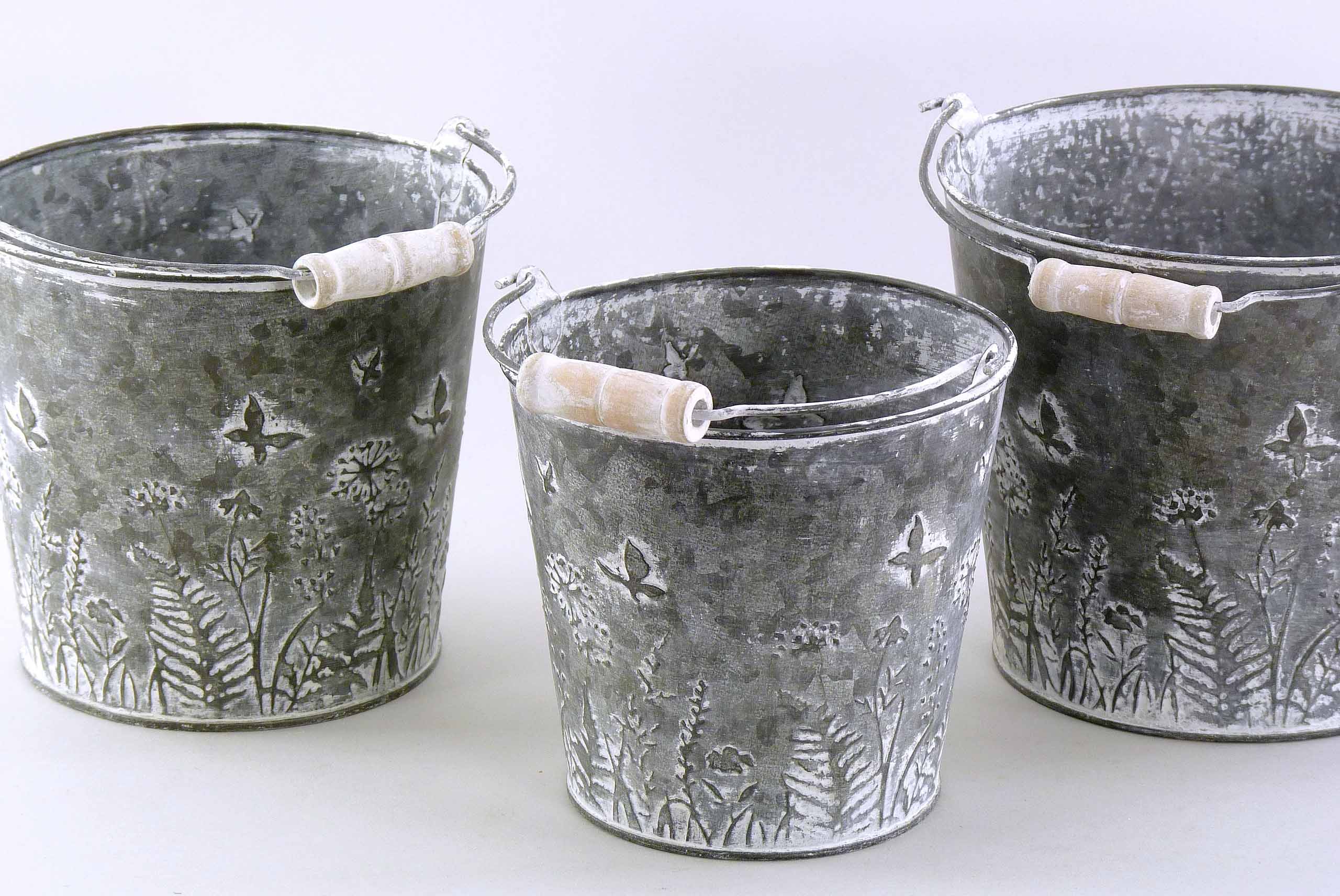 Metall-Kübel ''Wiese'' Set/3 zinkgrau-weiß ø13,5/15/17 H12,5/13,5/14,5cm