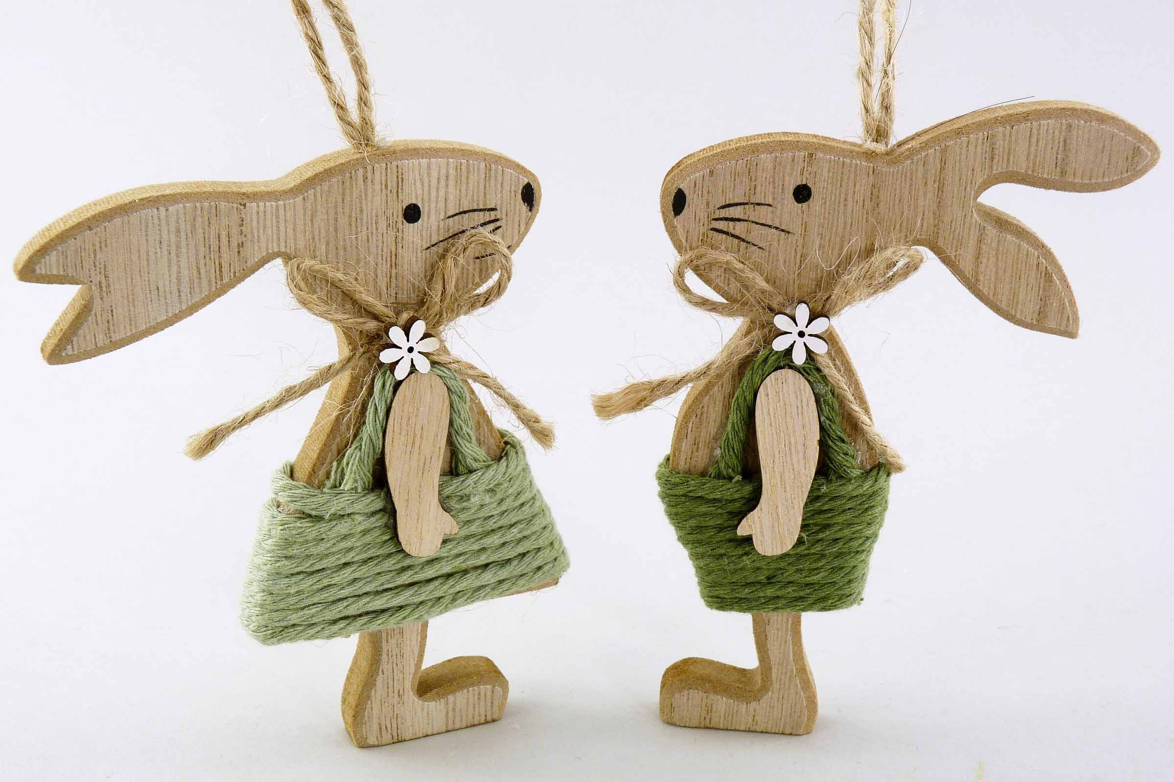 Holz/Jute-Hase hgd. natur-grün/mint sort. H11cm