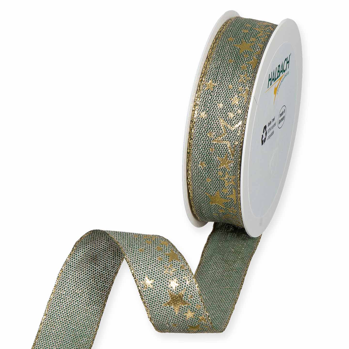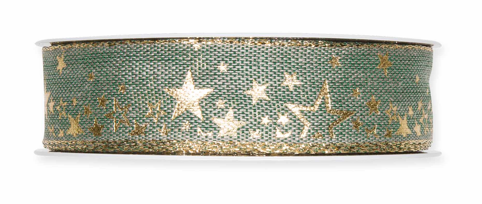 1703-025-32-15 Leinenband +DK ''Sternenflimmer'' grün-gold 15m