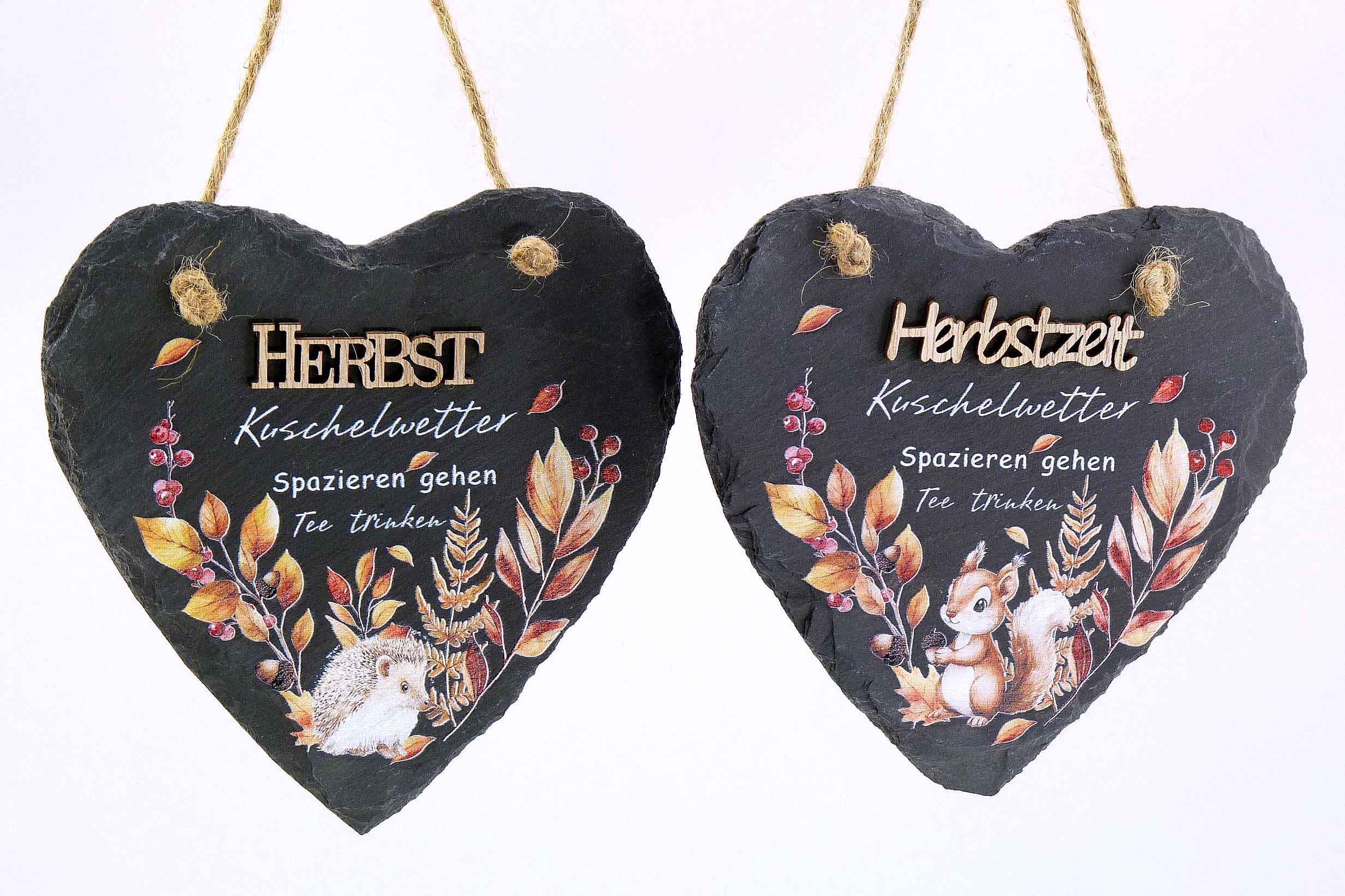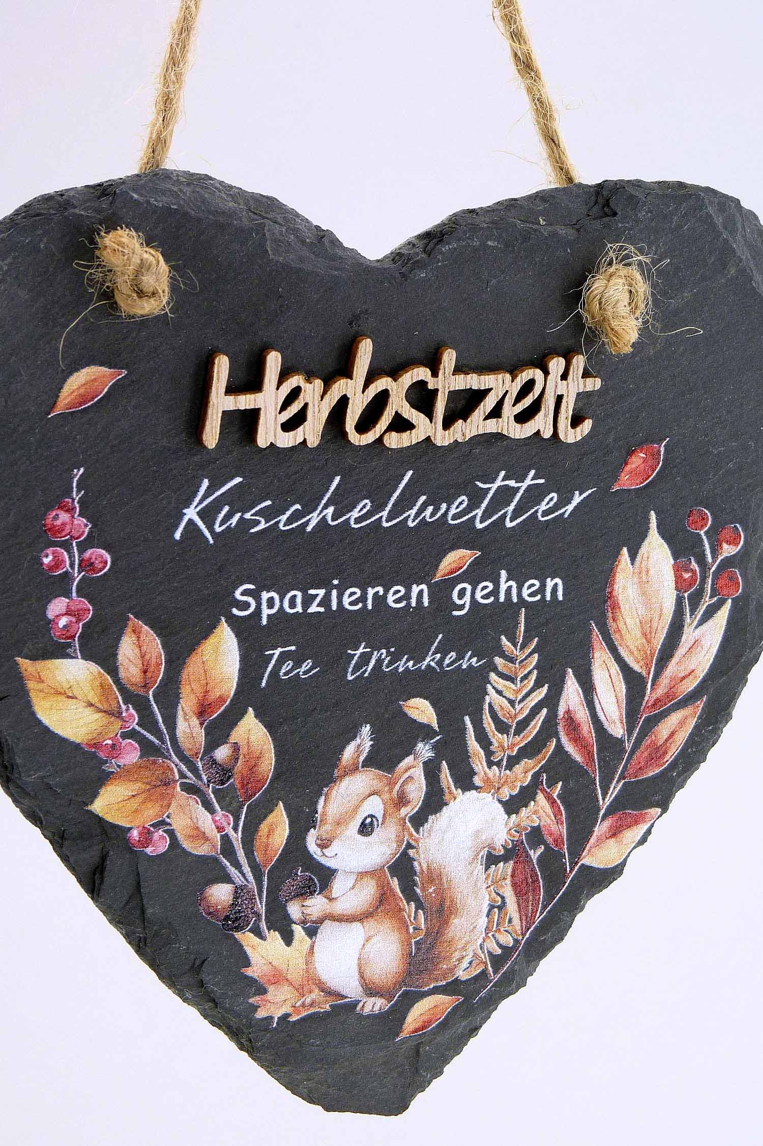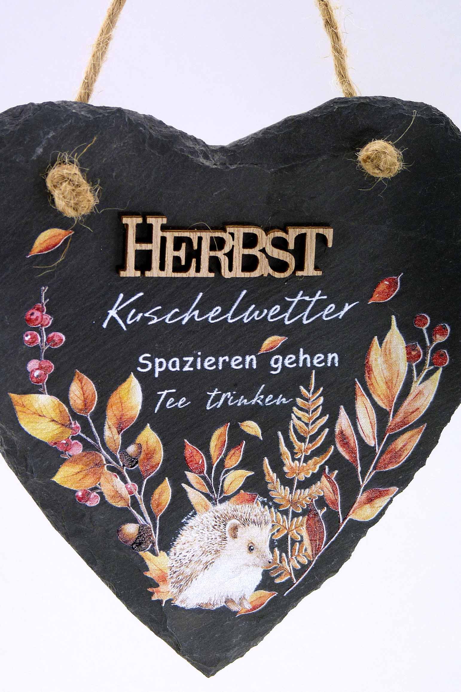 Schiefer/Holz-Herz mit Herbst-Spruch hgd. schwarz-orange sort. ø14,5cm