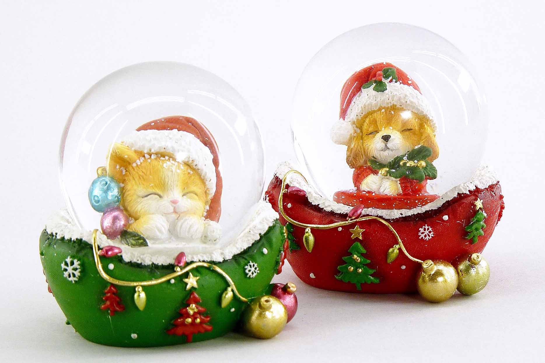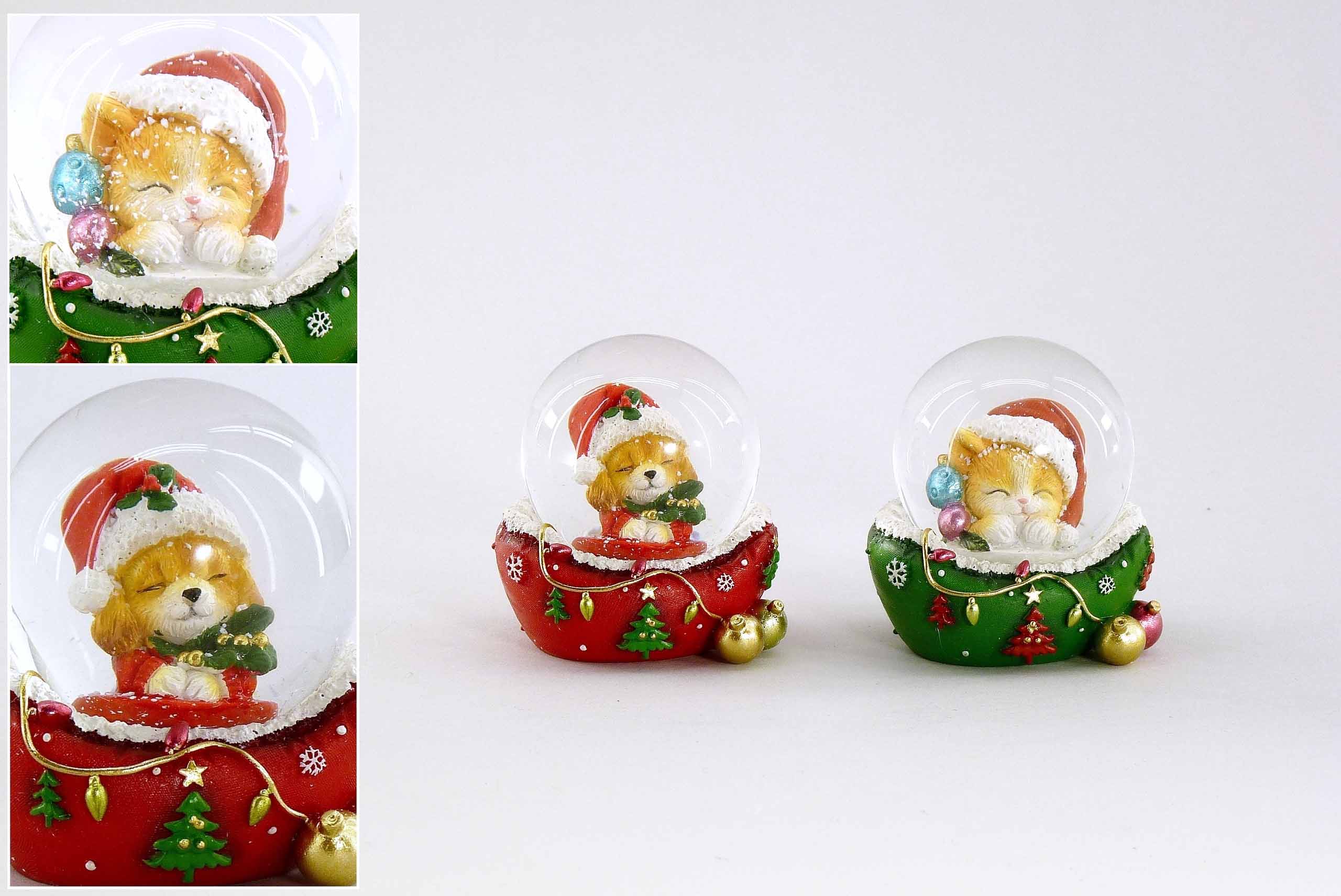 Poly-Schneekugel ''Hund&Katz'' im Körbchen rot/grün sort. ø5 H6,5cm