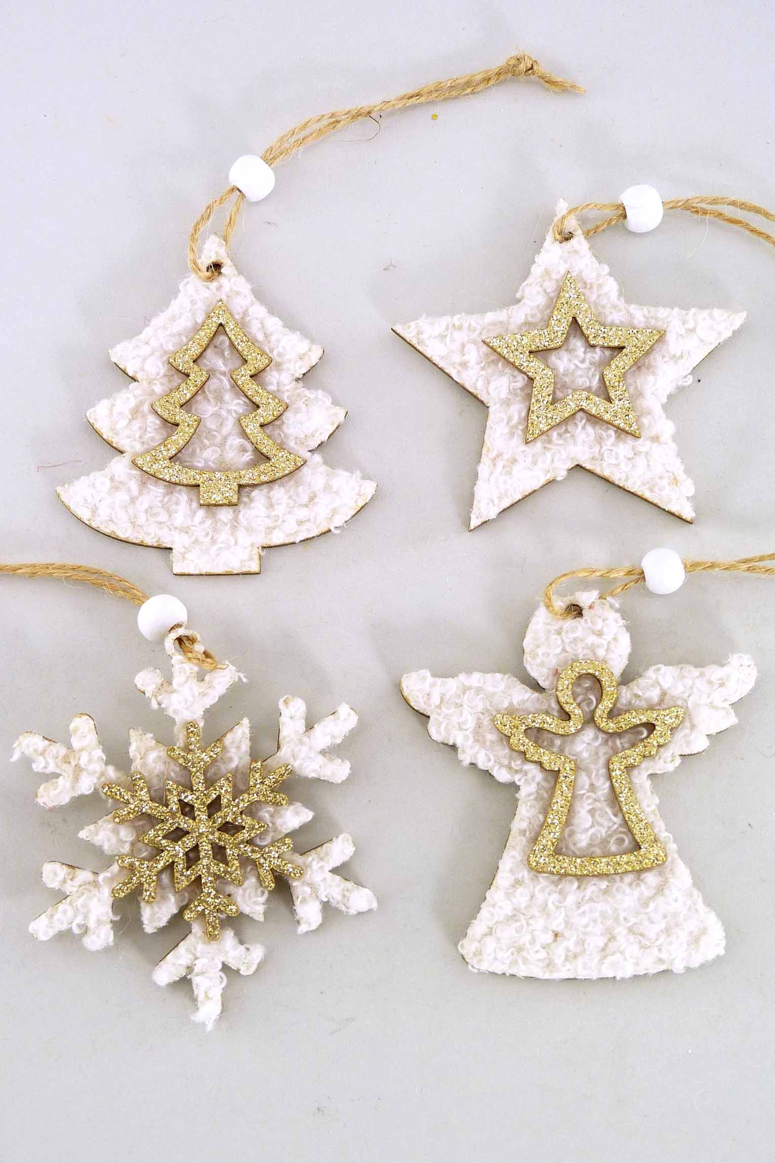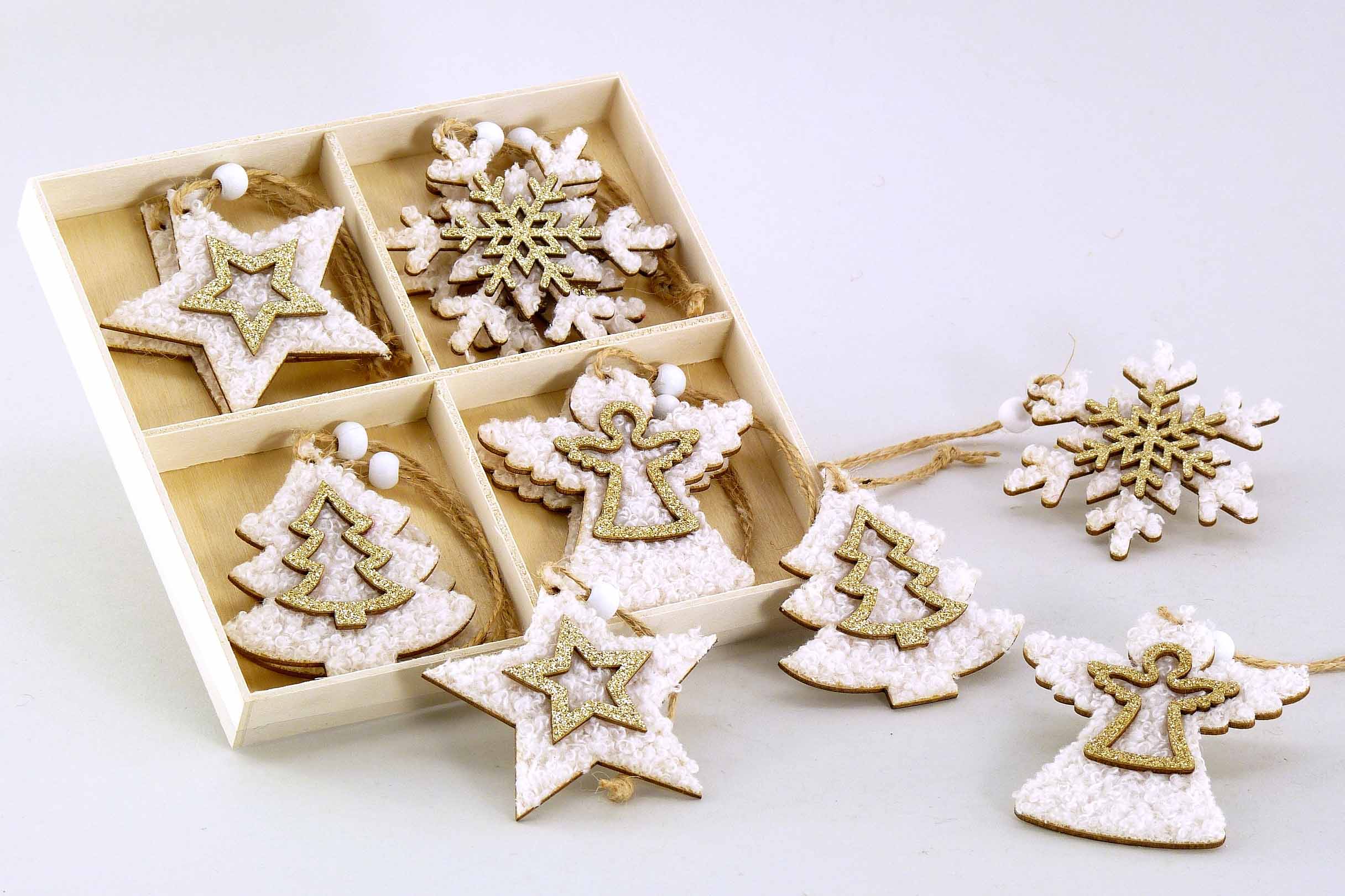 Stoff/Holz-Weihnachtsmotive Box/12 hgd. weiß-gold H6-7cm