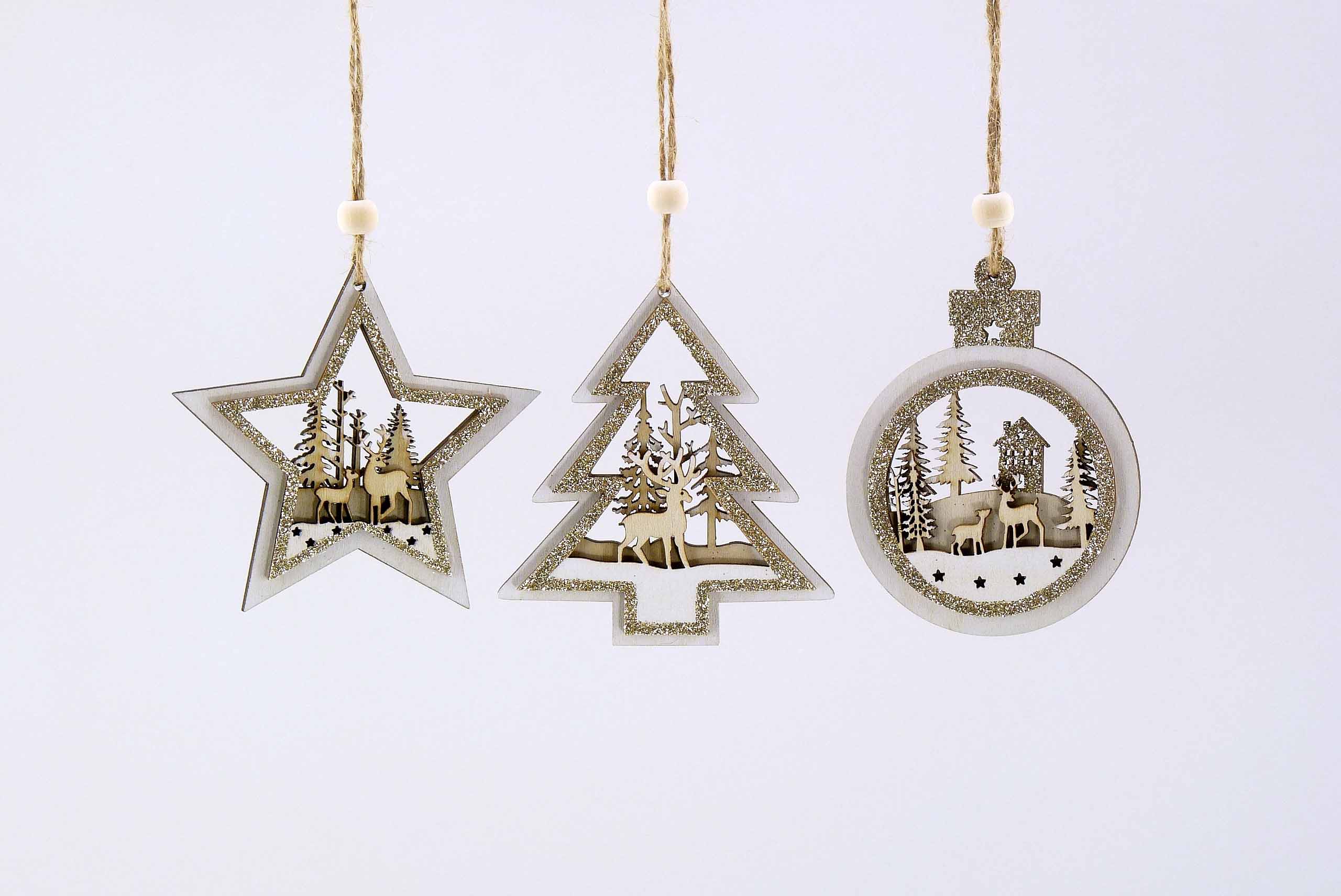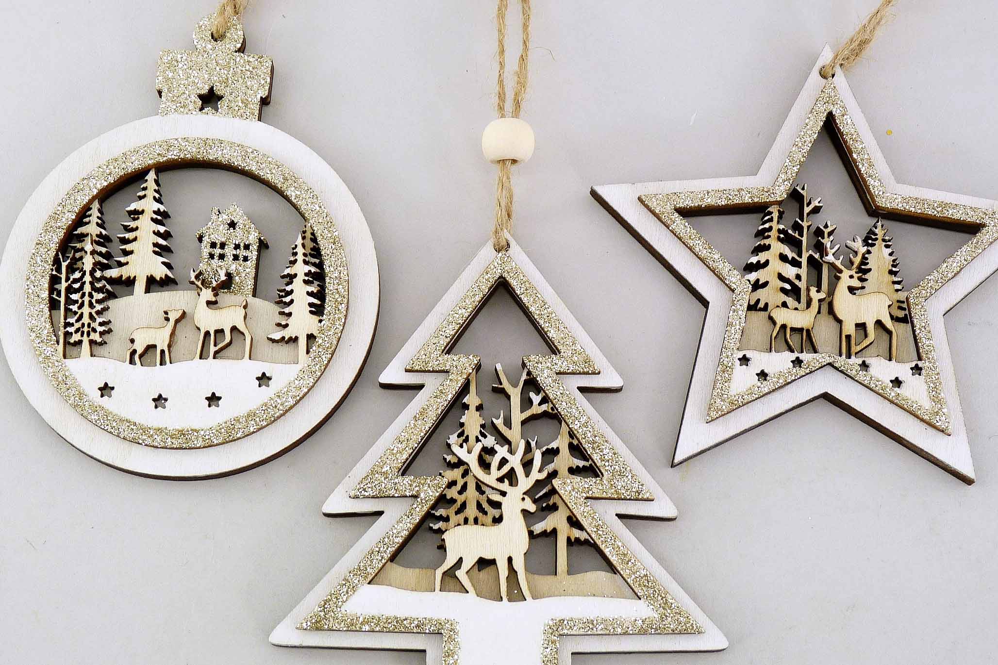 Holz-Stern/Baum/Kugel ''Winterbild'' hgd. natur-weiß-gold ø9-10cm