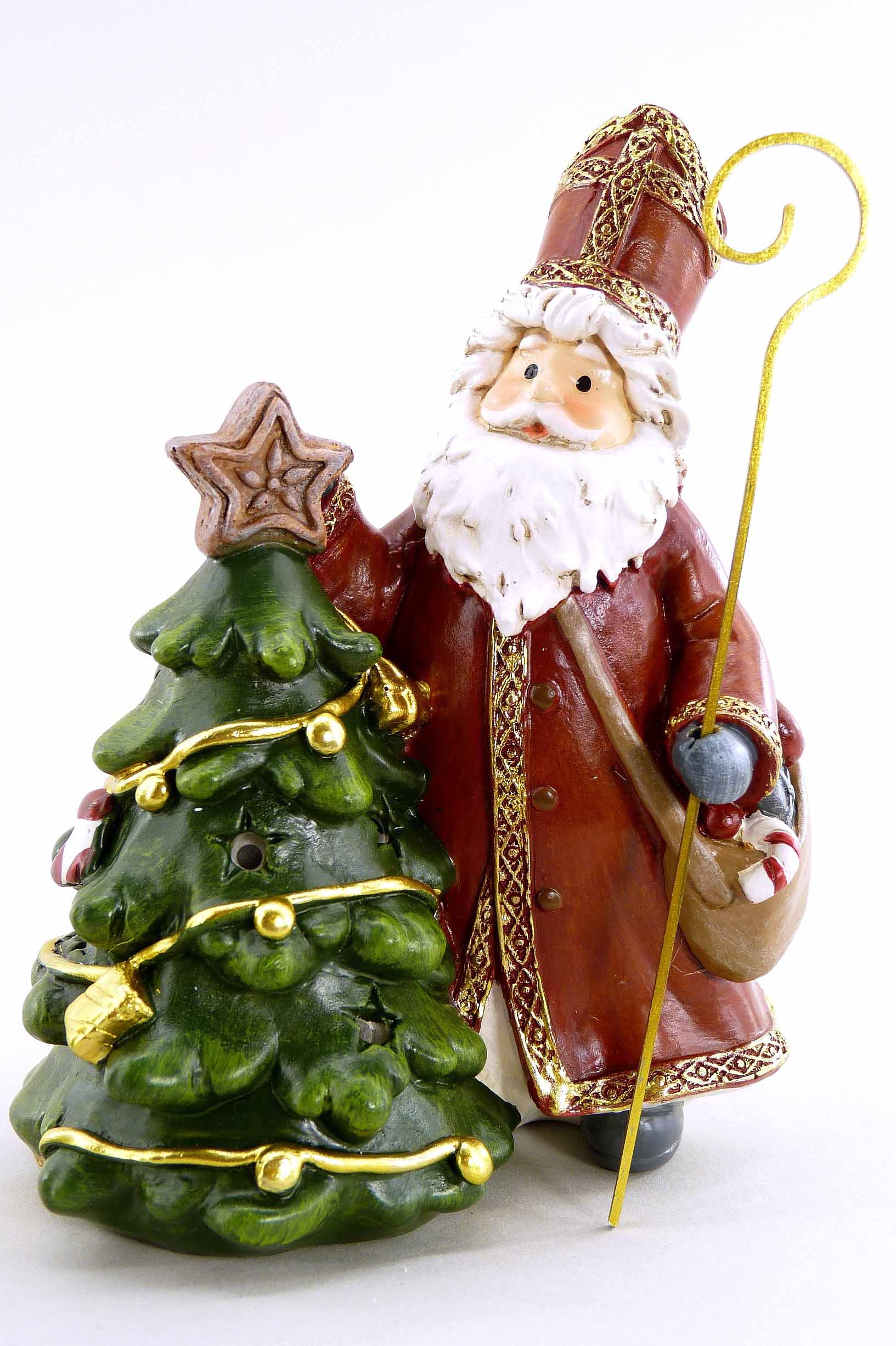 Poly-Nikolaus mit Christbaum (LED) rot-weiß-gold sort. H13,5 B11cm