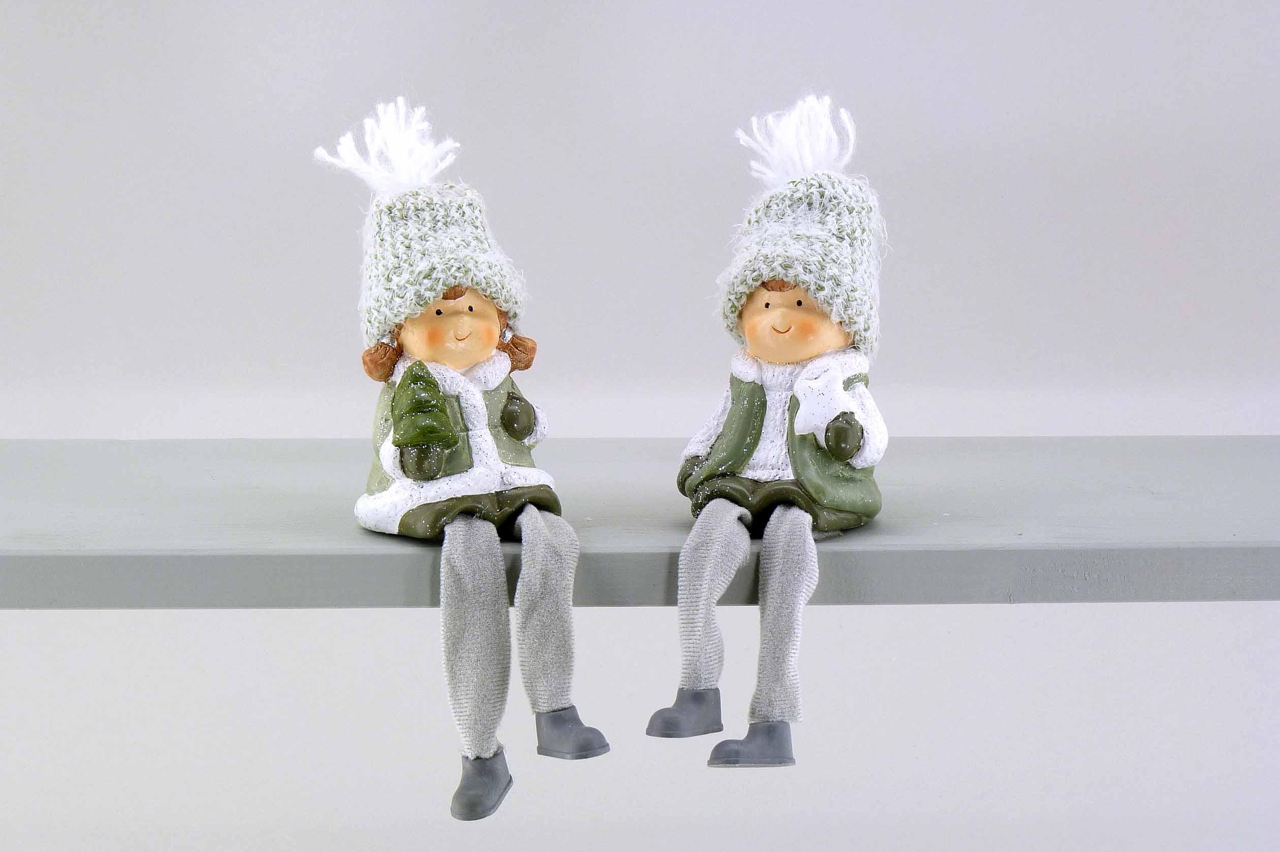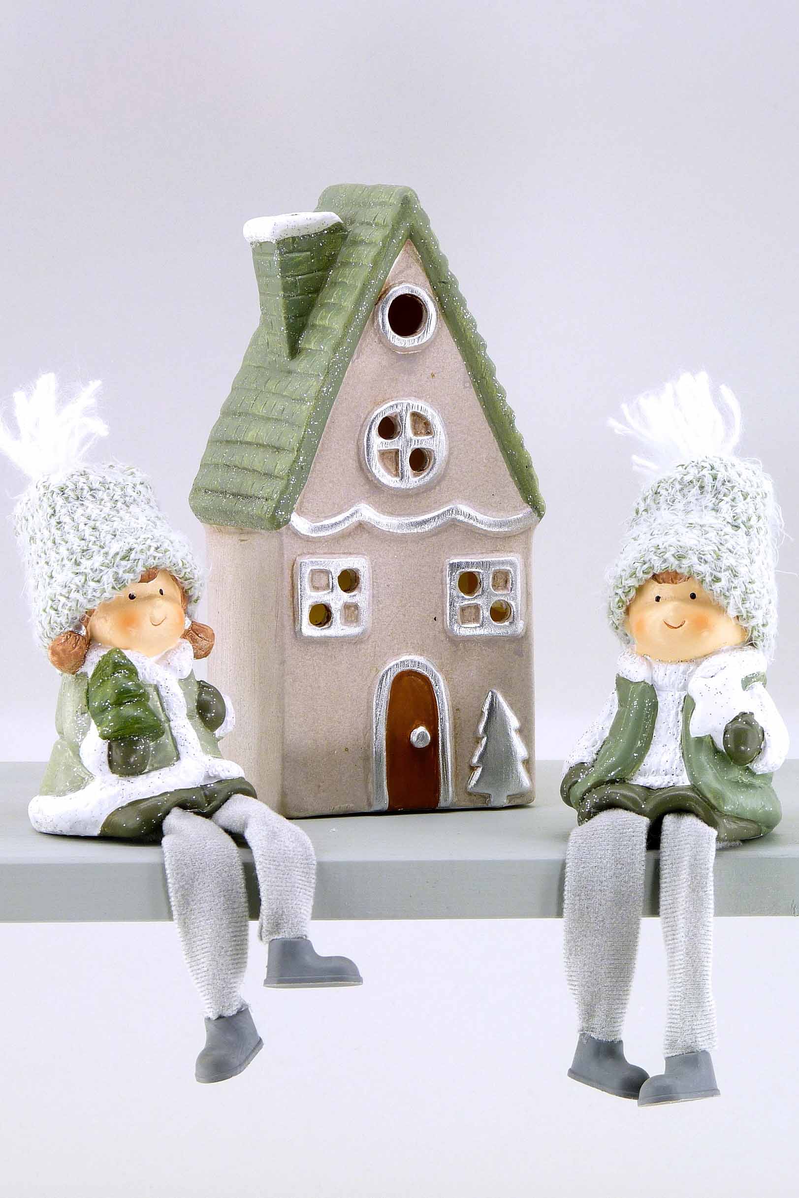 Keramik-Winterkind Kantenhocker grau-weiß-grün sort. H12 L21cm