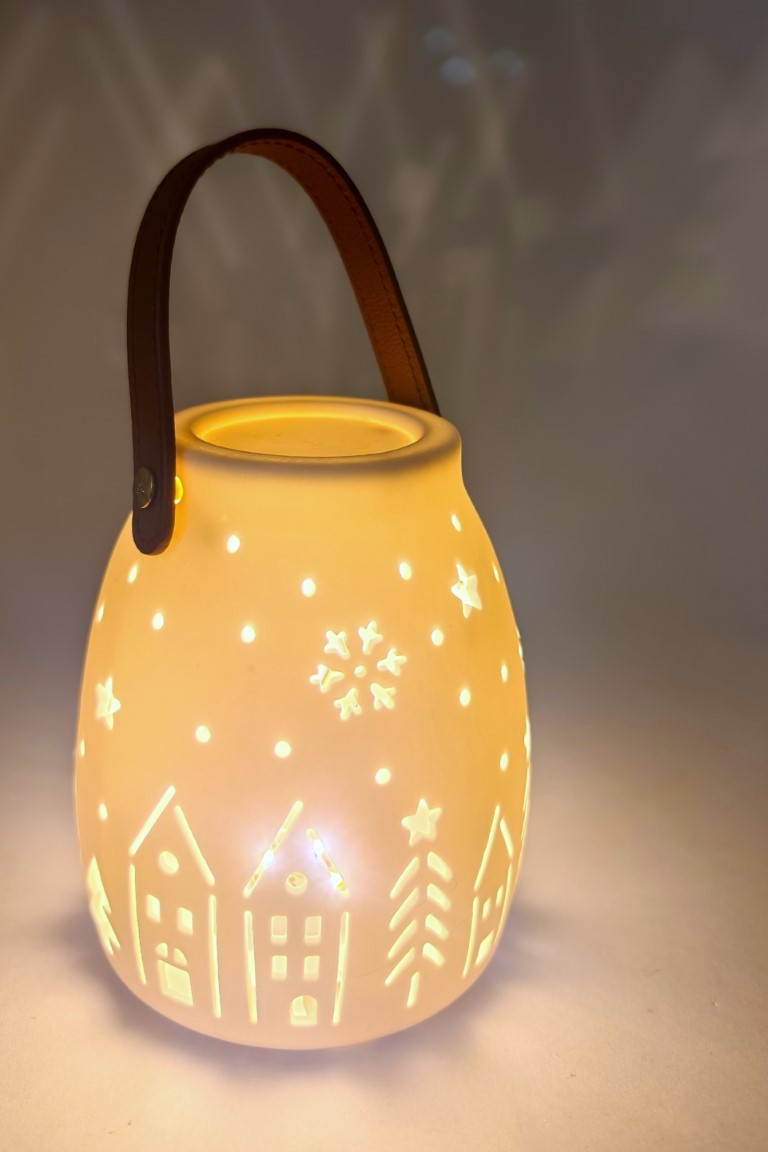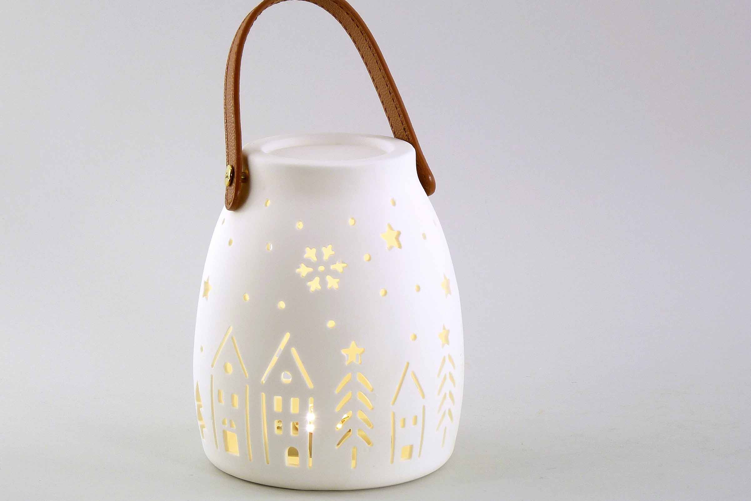 Porzellan-Laterne ''Winterbild'' +LED rund natur-weiß ø12 H14cm