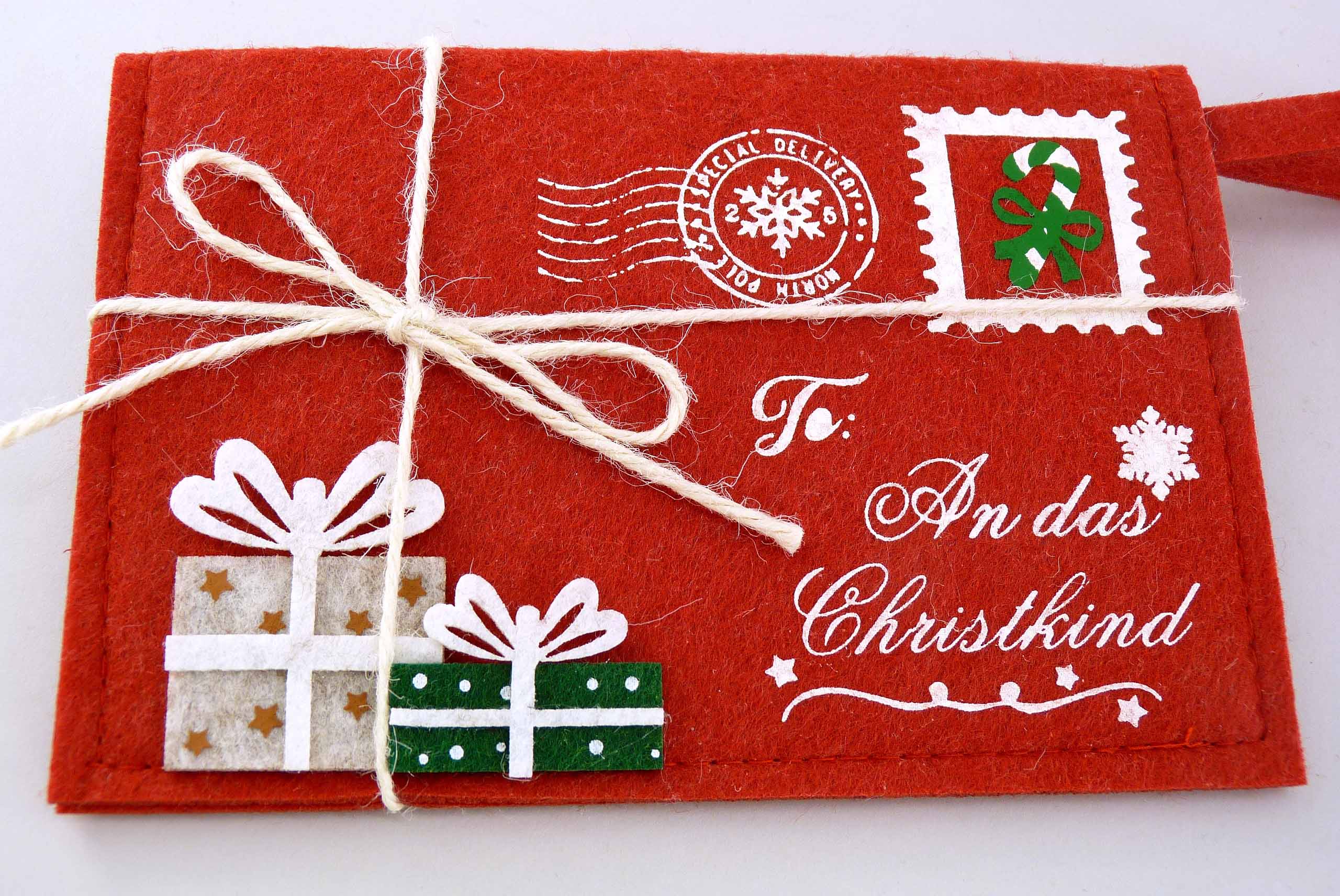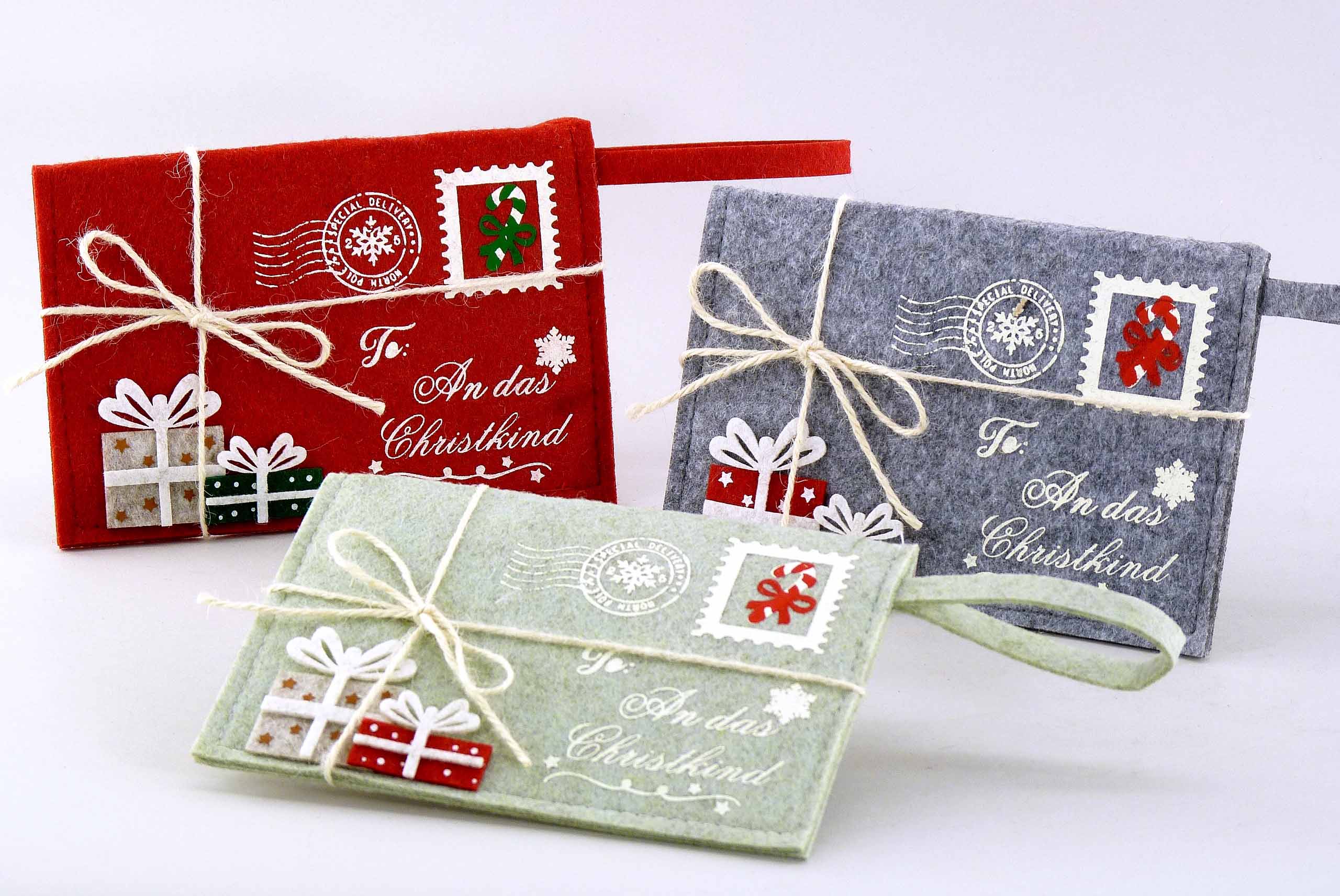 Filz-Kuvert ''ans Christkind'' grau/rot/grün sort. H10,5 B16cm