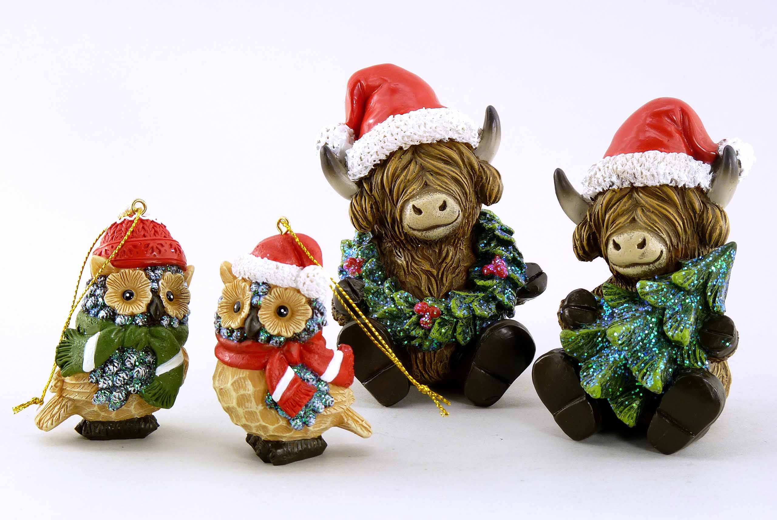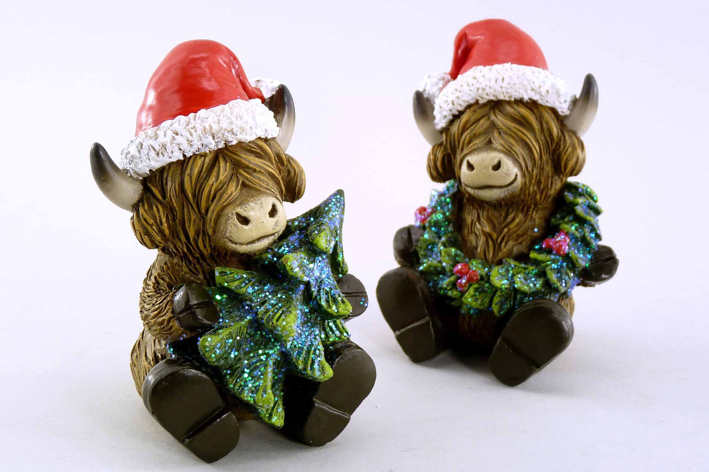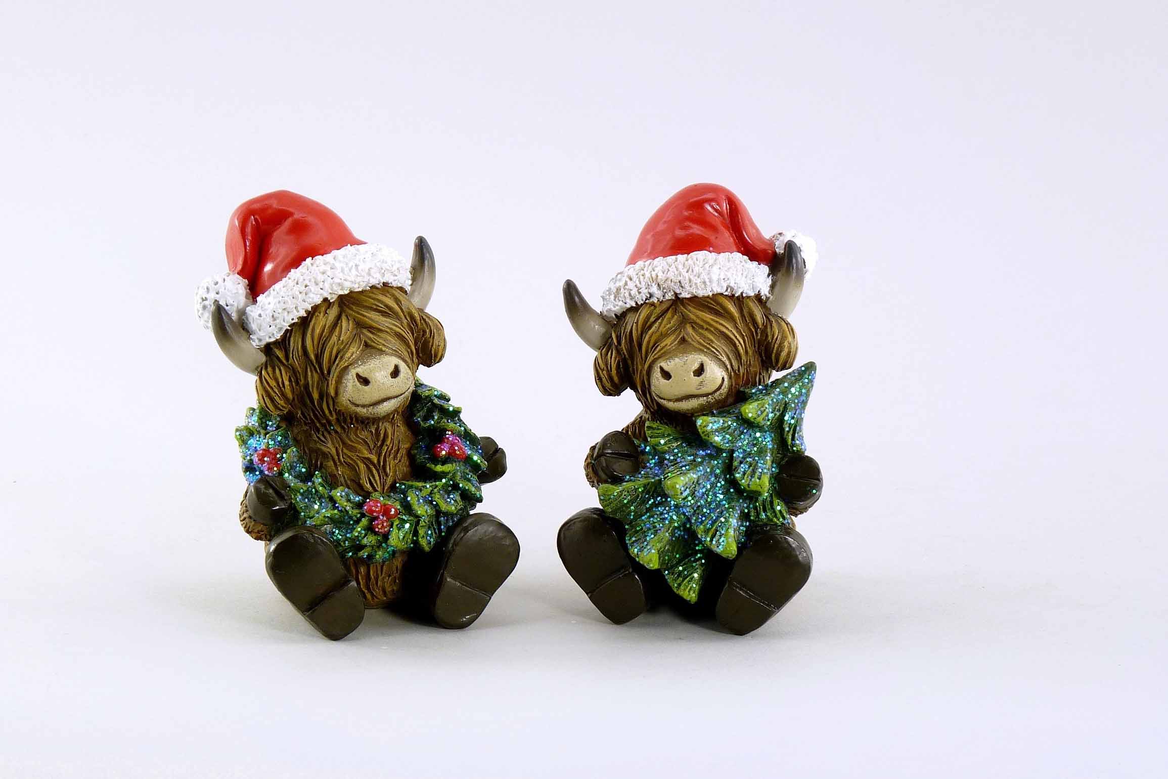 Poly-Zottelkuh mit Weihnachtsmütze rot-grün-braun sort. H10,5cm