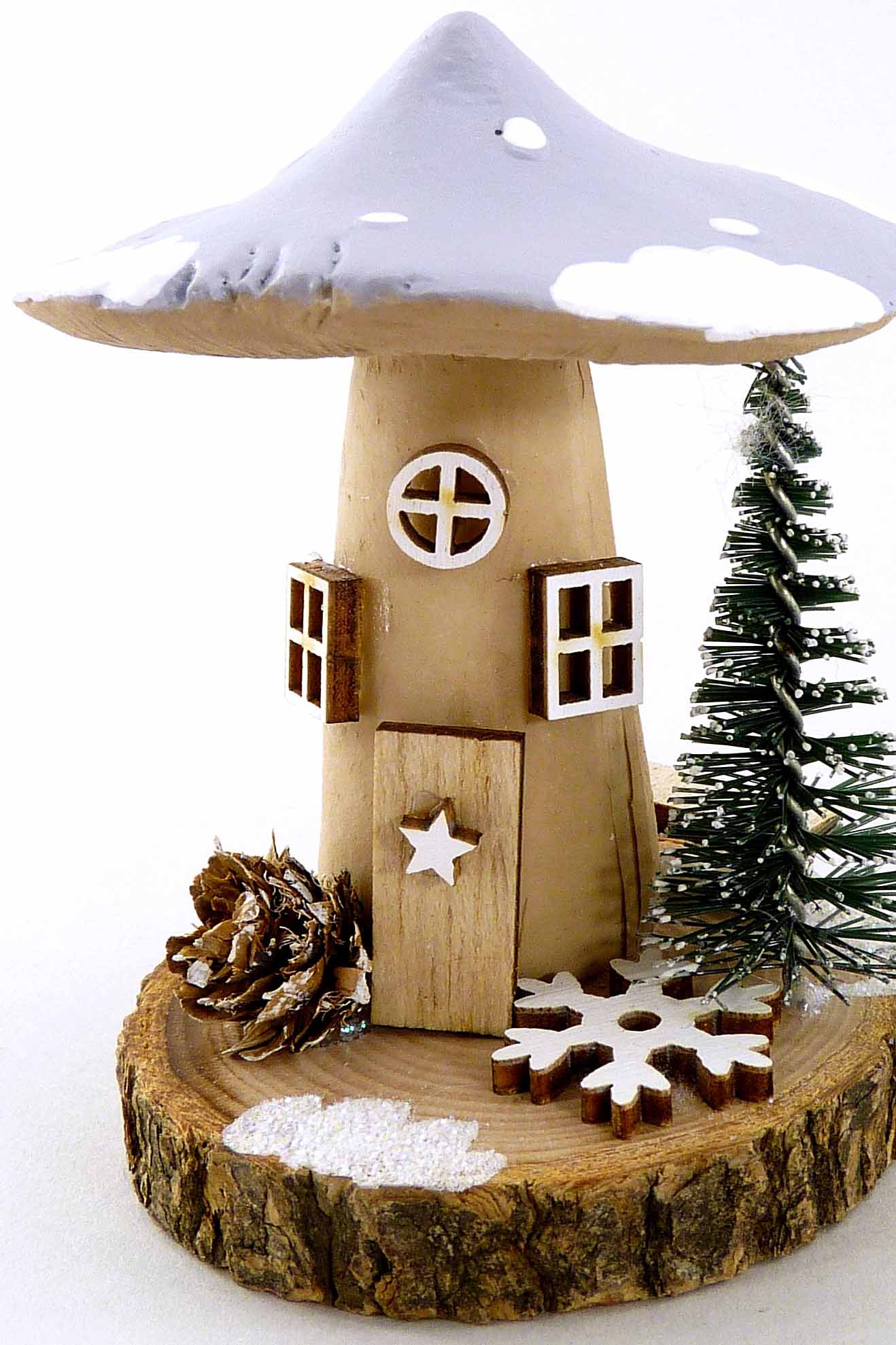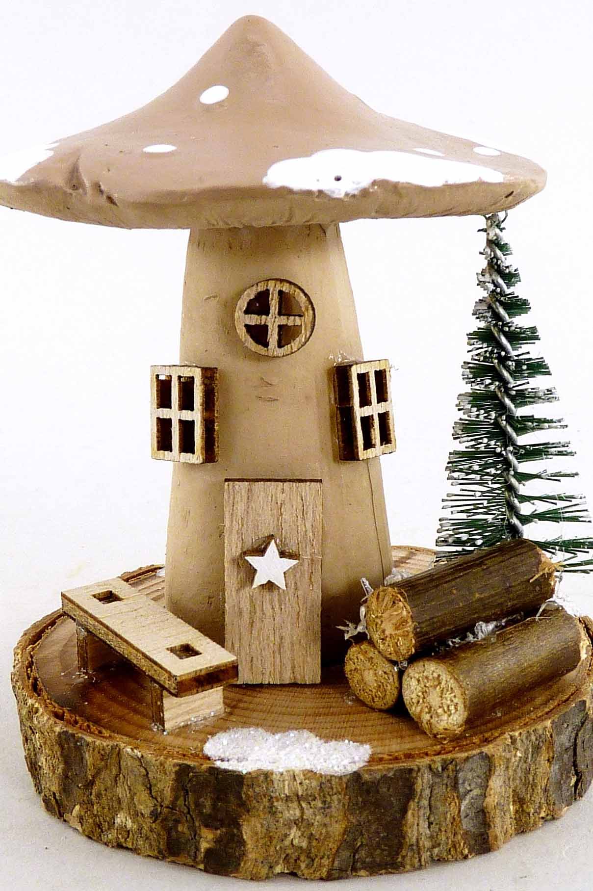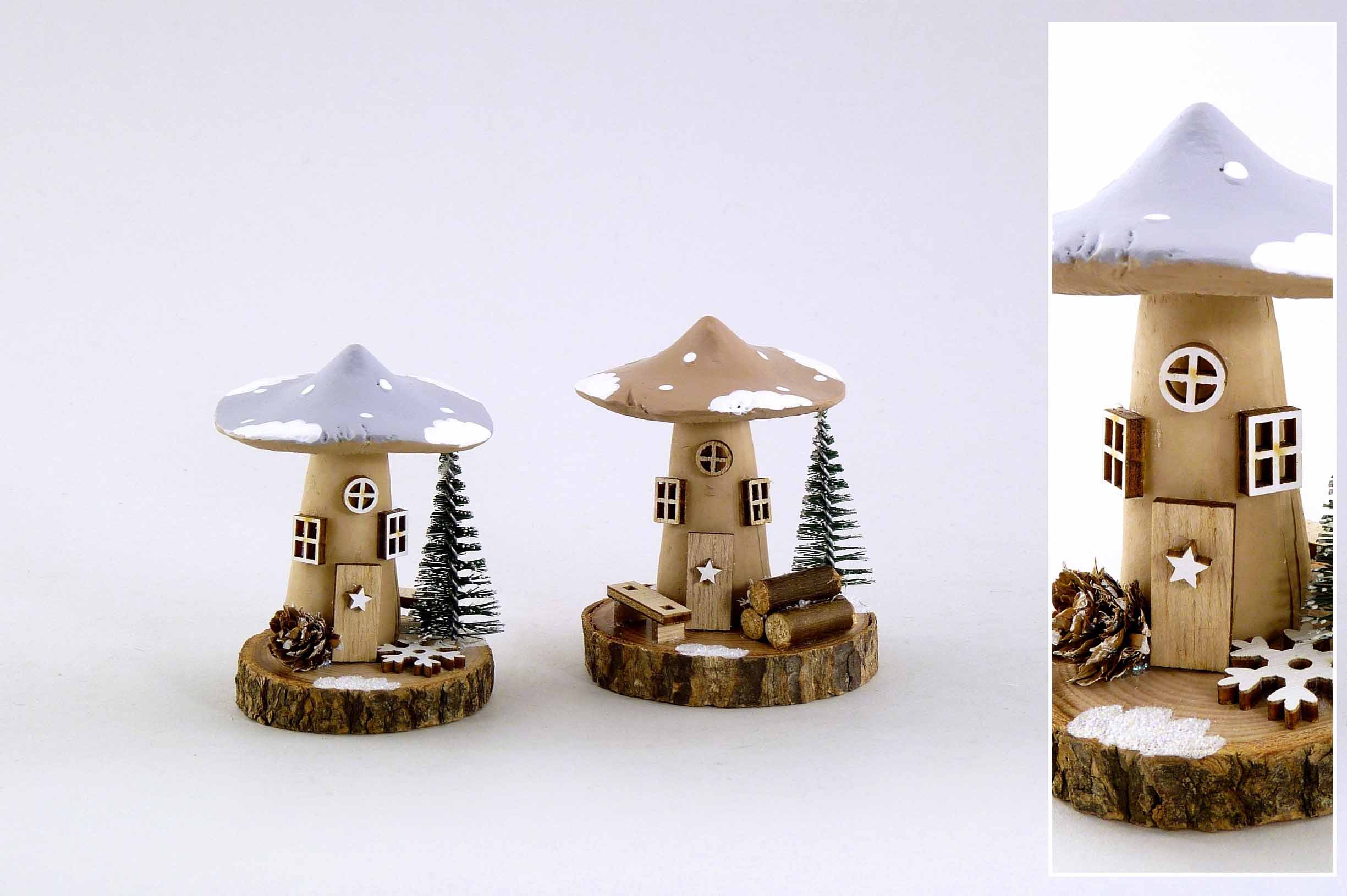 Poly/Holz-Pilz ''Wichtelhaus'' grau/braun-weiß sort. ø6 H7cm