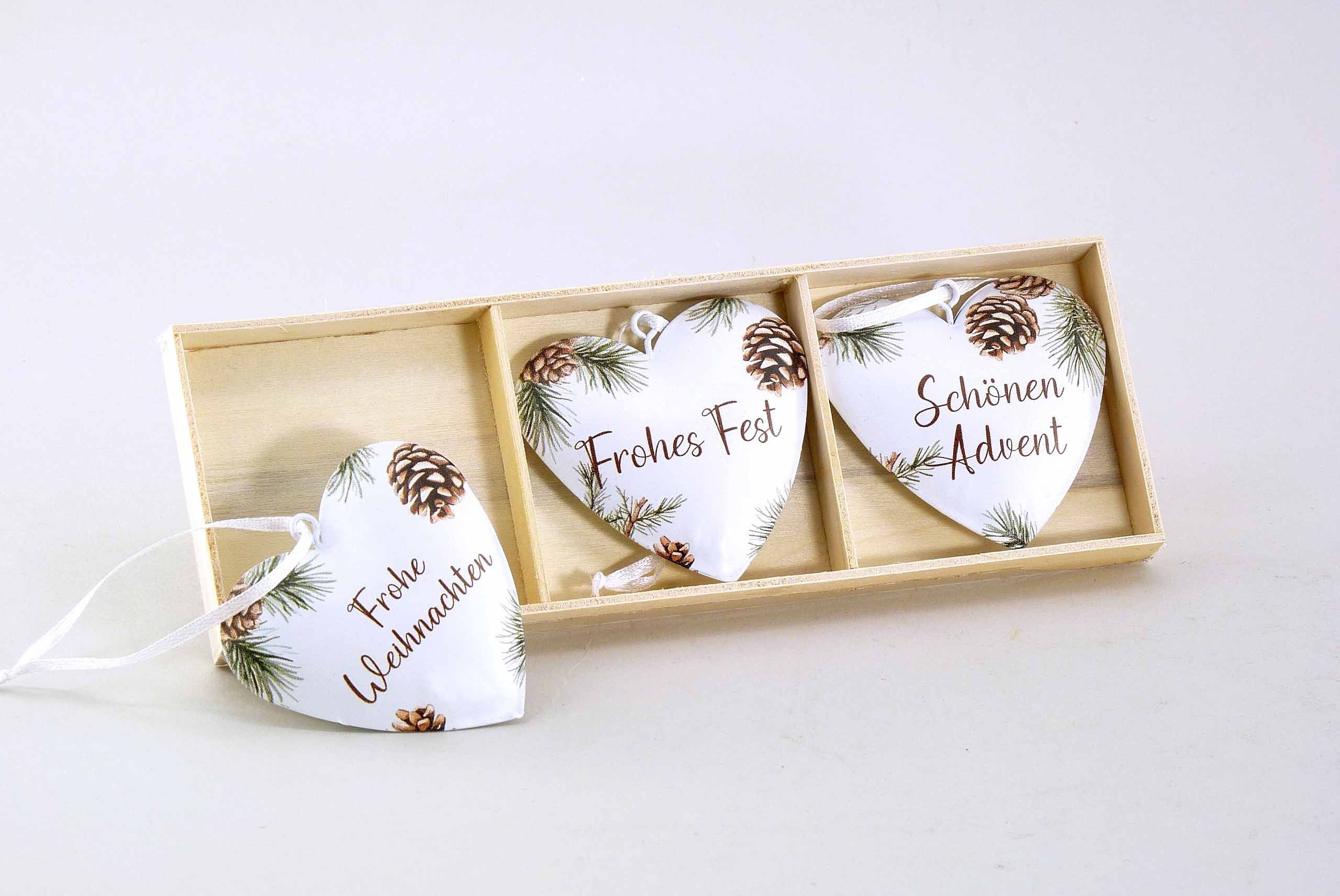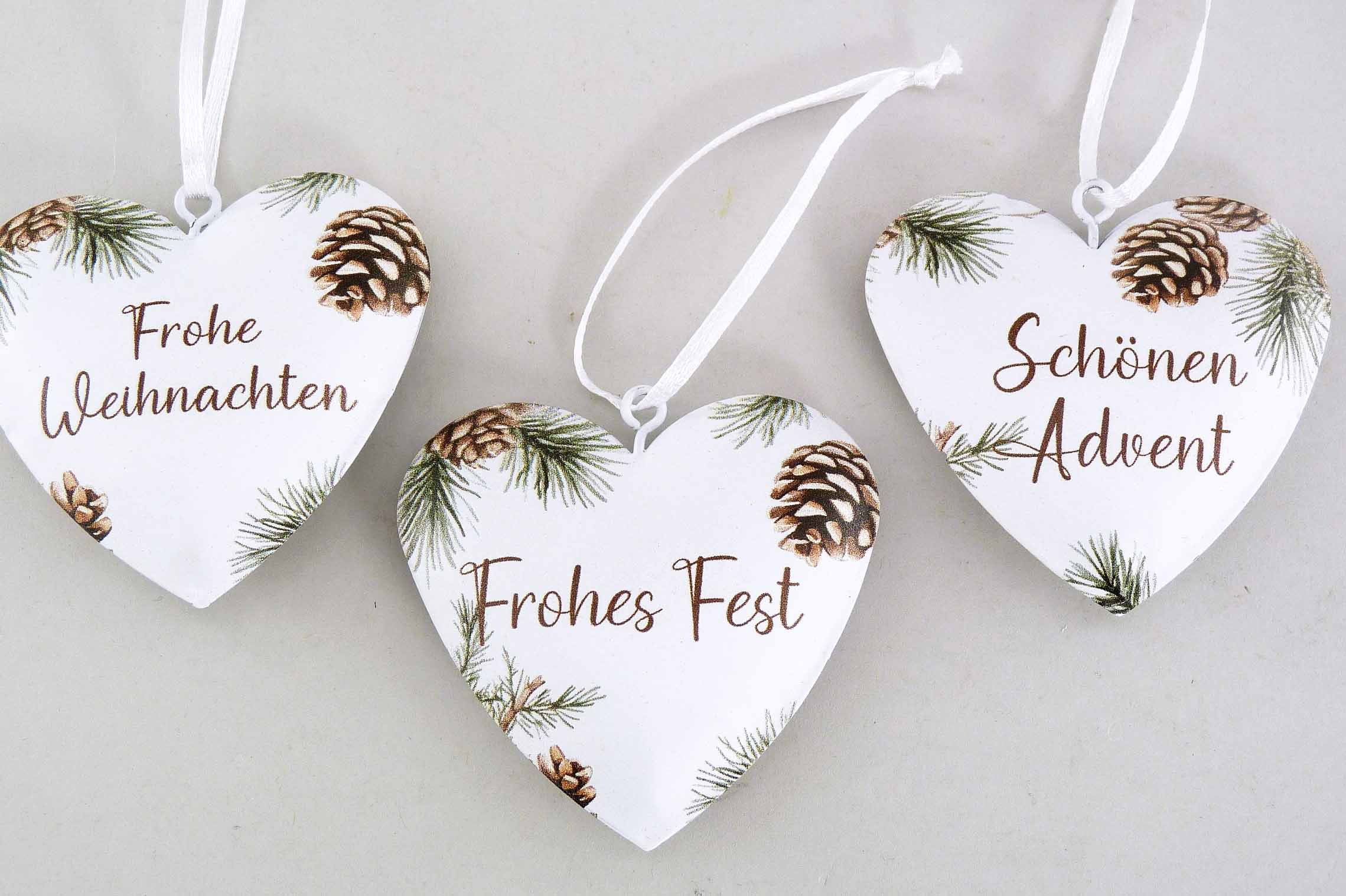 Metall-Herz ''Weihnachtsgruß'' Box/3 hgd. weiß-grün-braun ø6,5cm