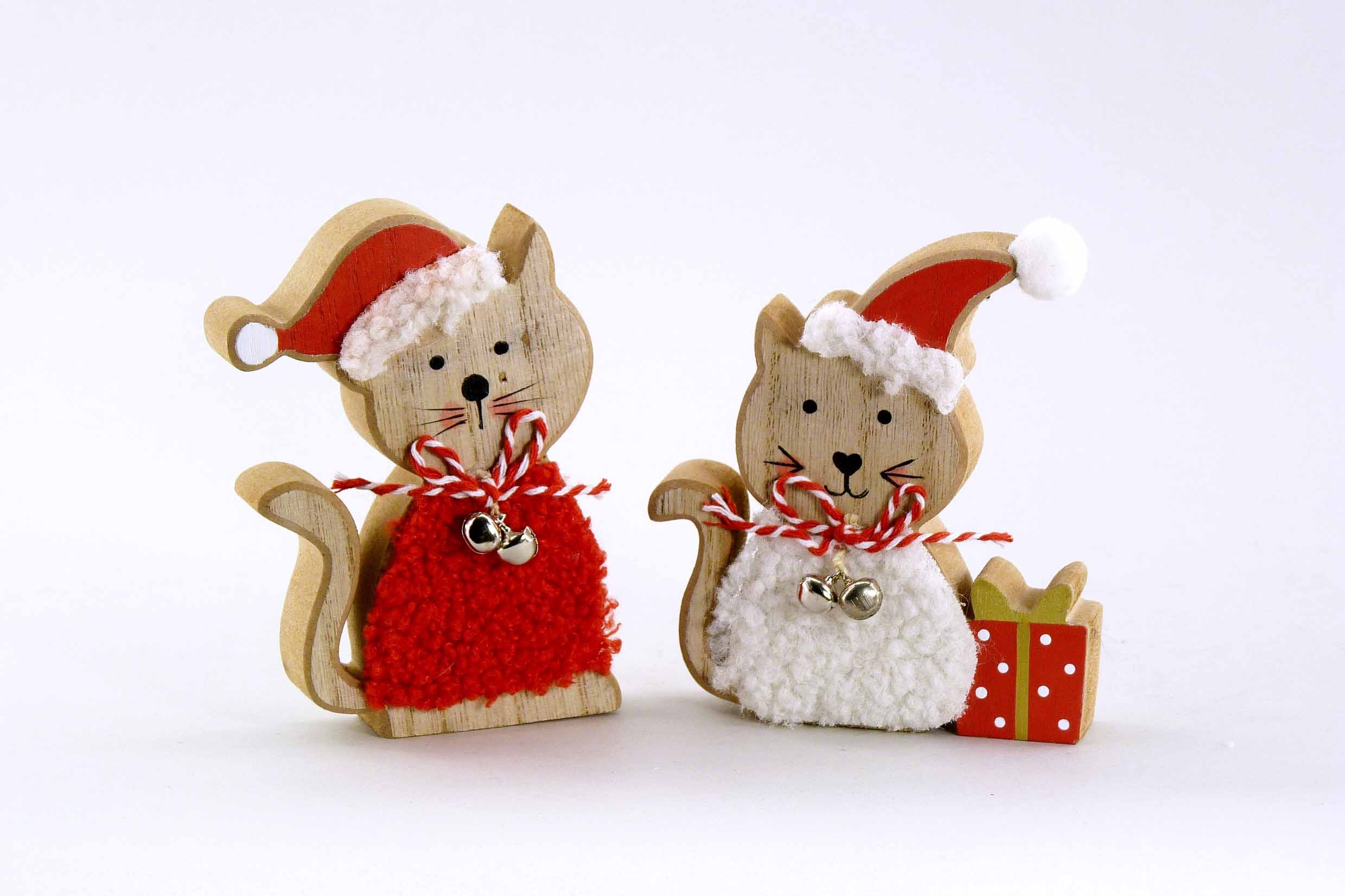 Stoff/Holz-Katze natur-rot-weiß sort. H12,5cm