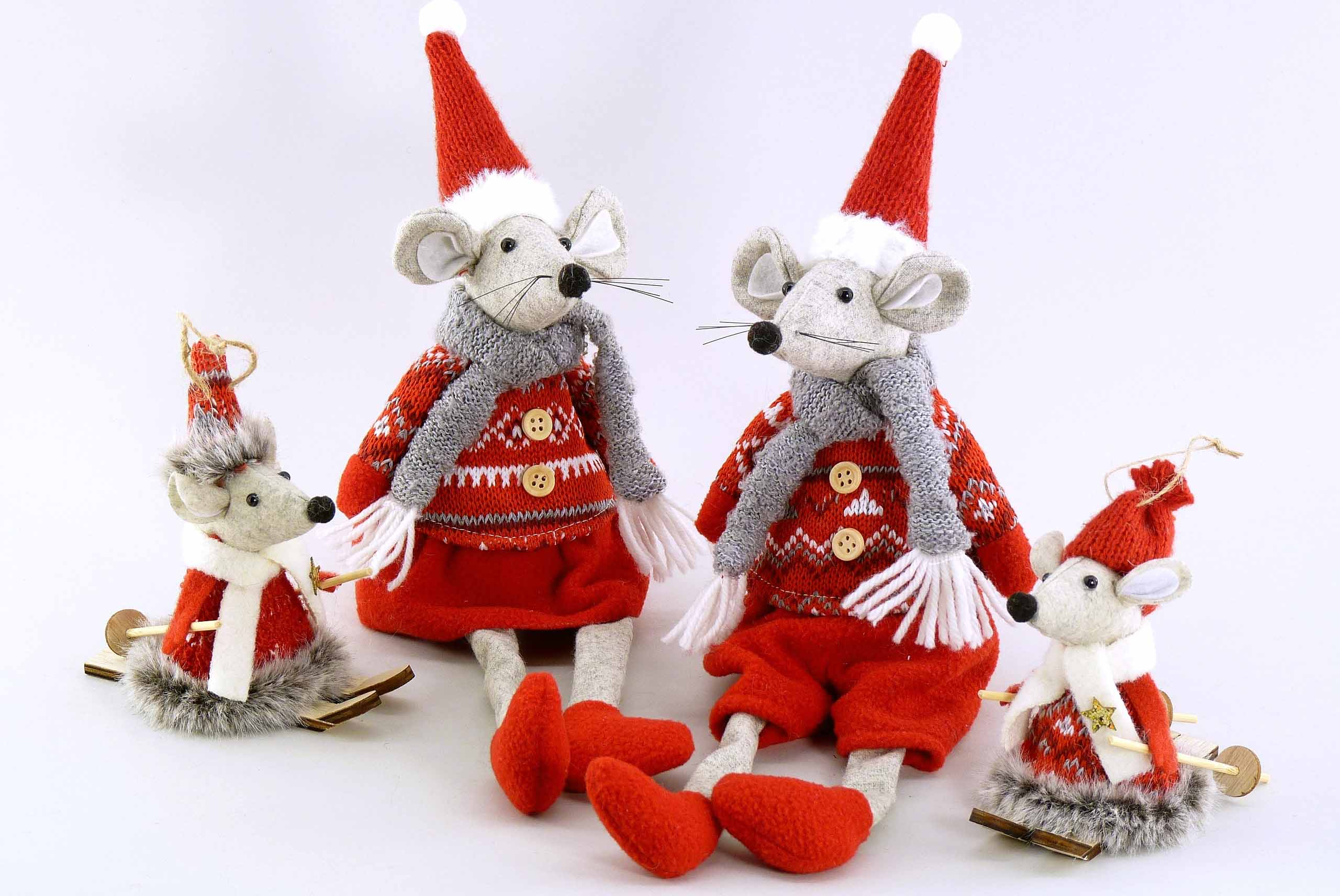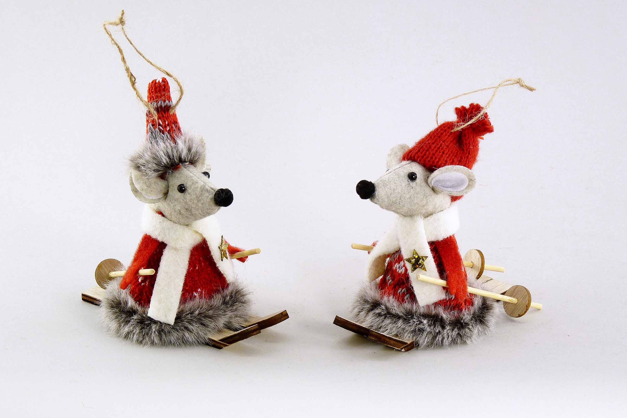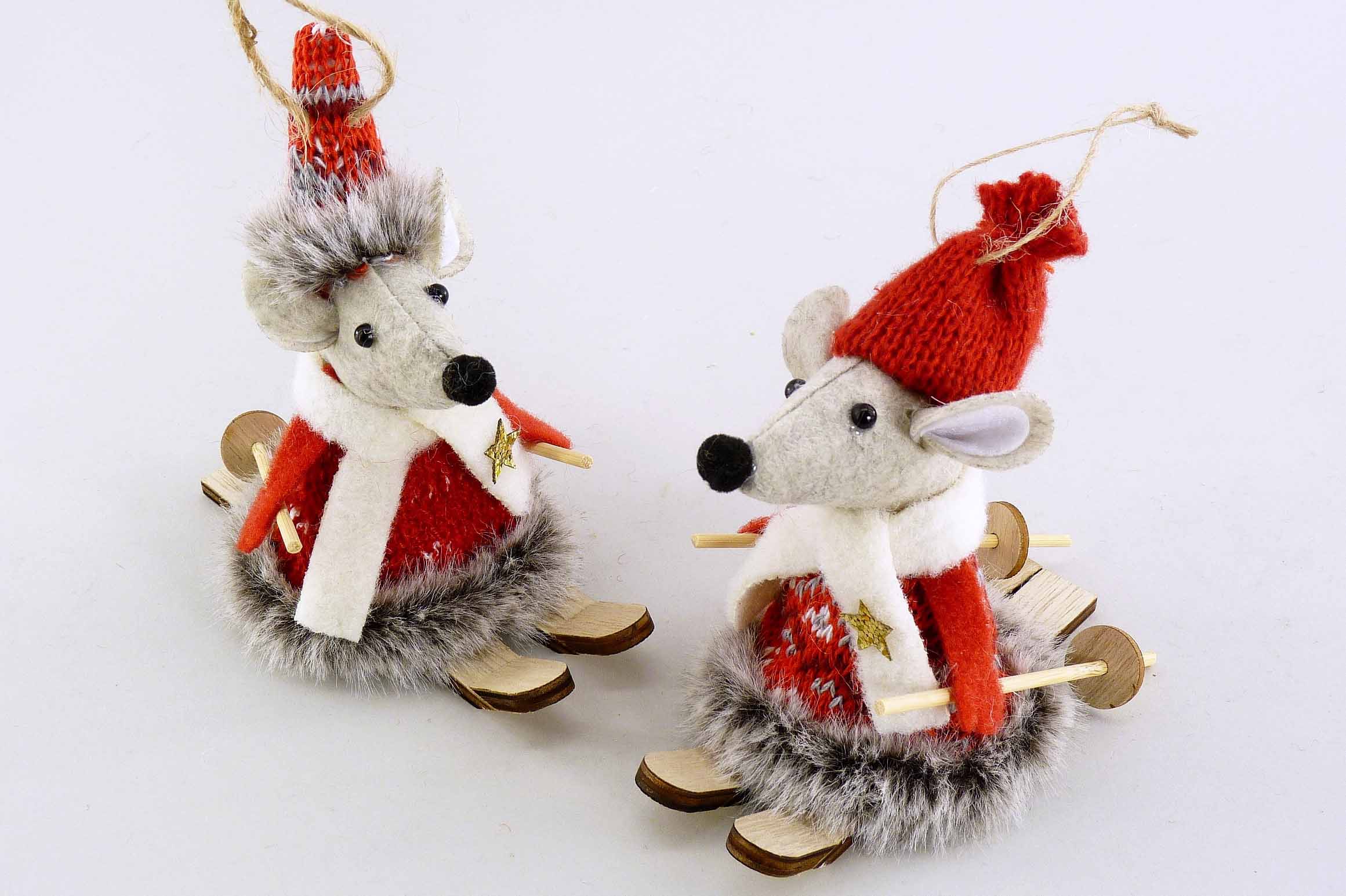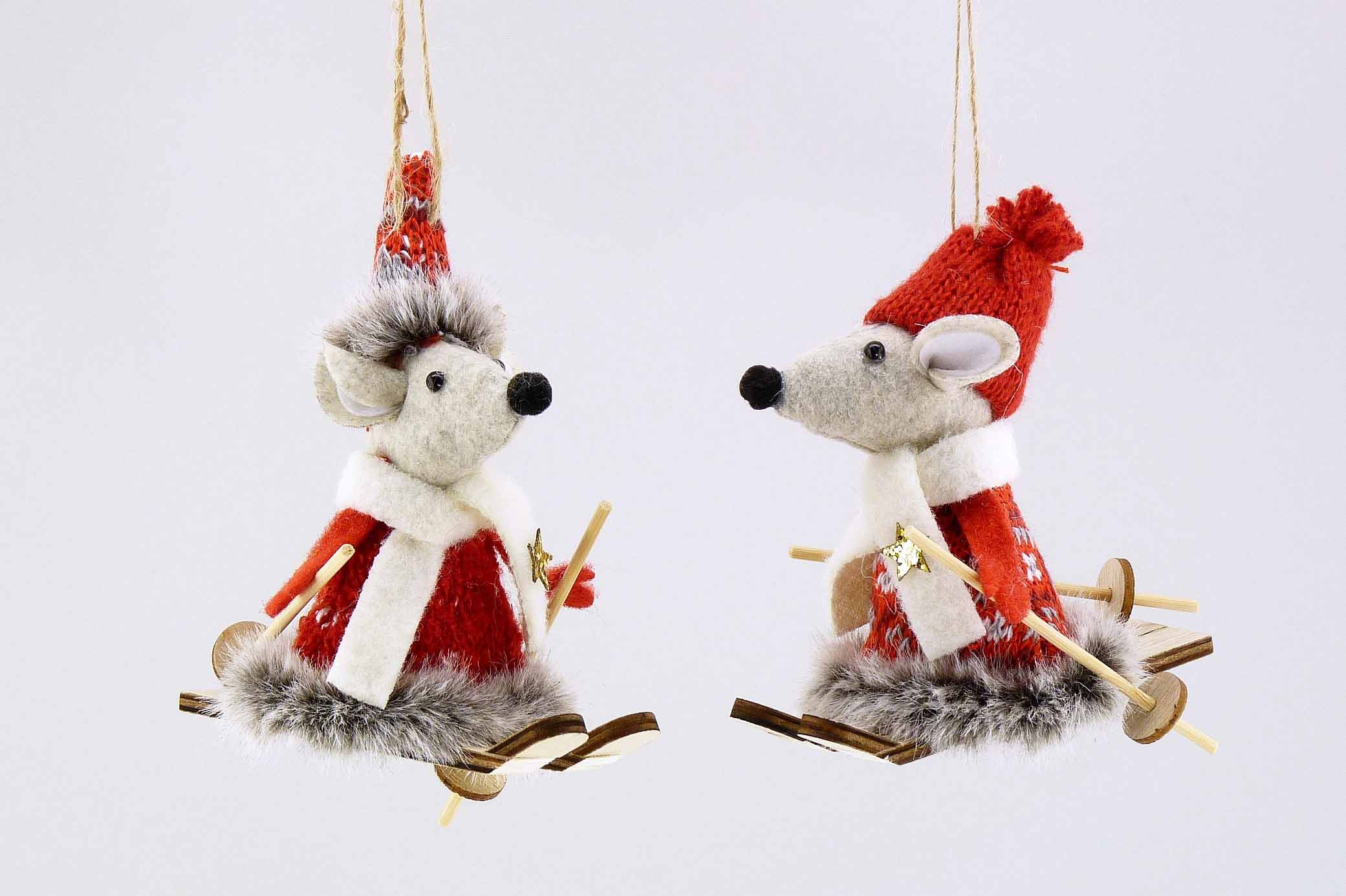 Stoff-Wintermaus auf Ski hgd. rot-weiß-grau sort. H11,5cm