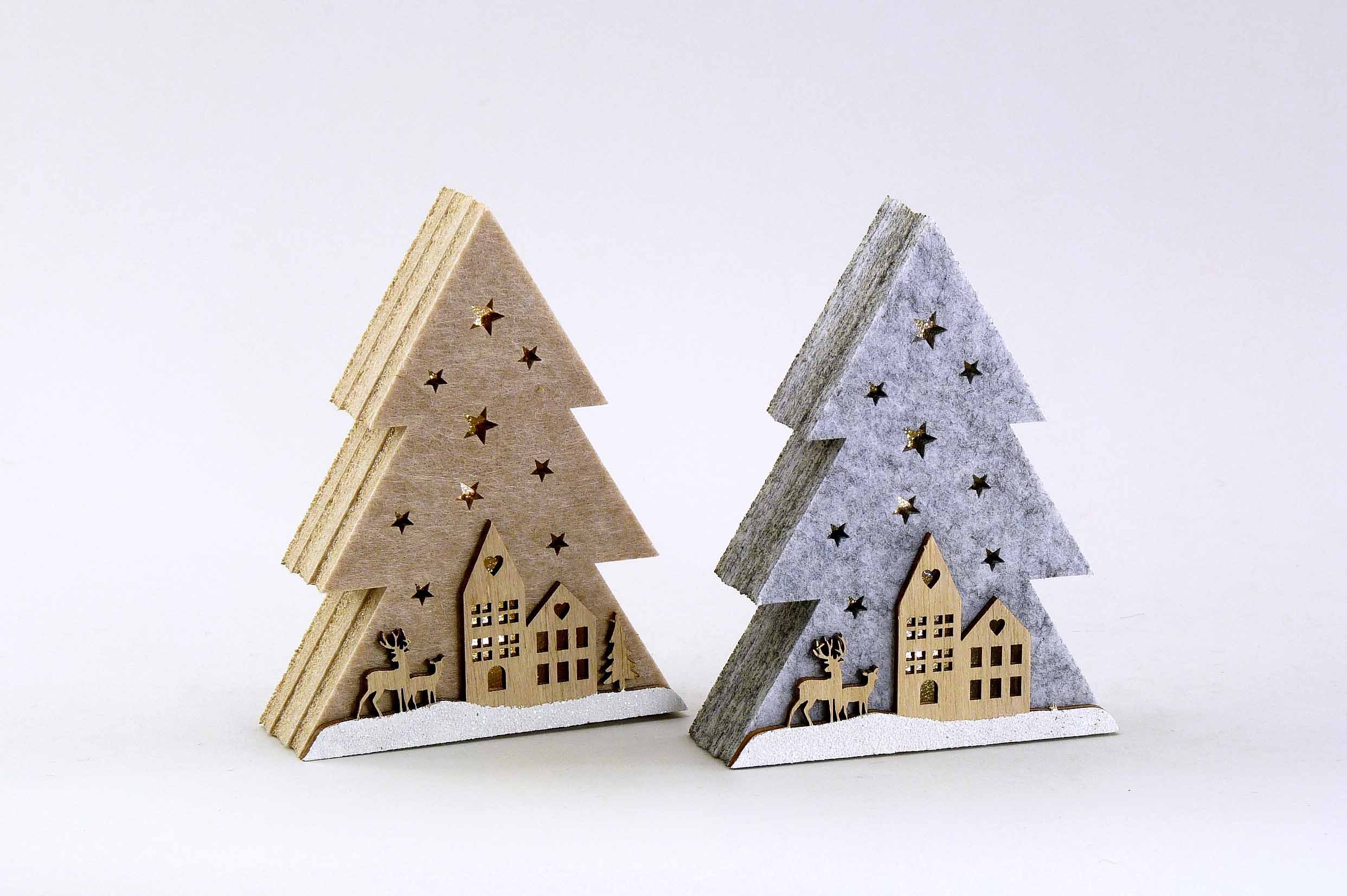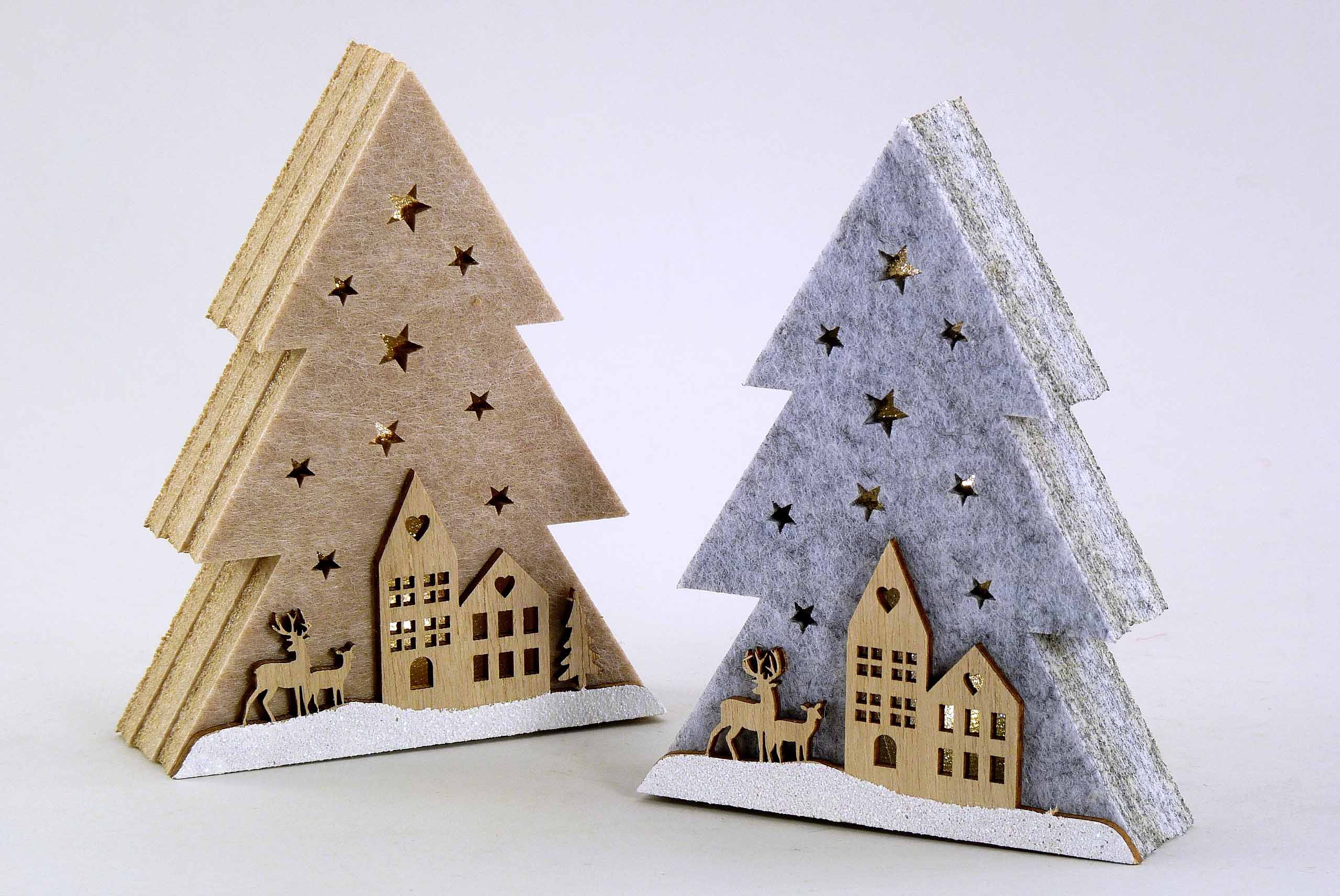 Filz/Holz-Baum ''Winterstadt'' +LED grau/braun-weiß sort. 10x3 H13cm