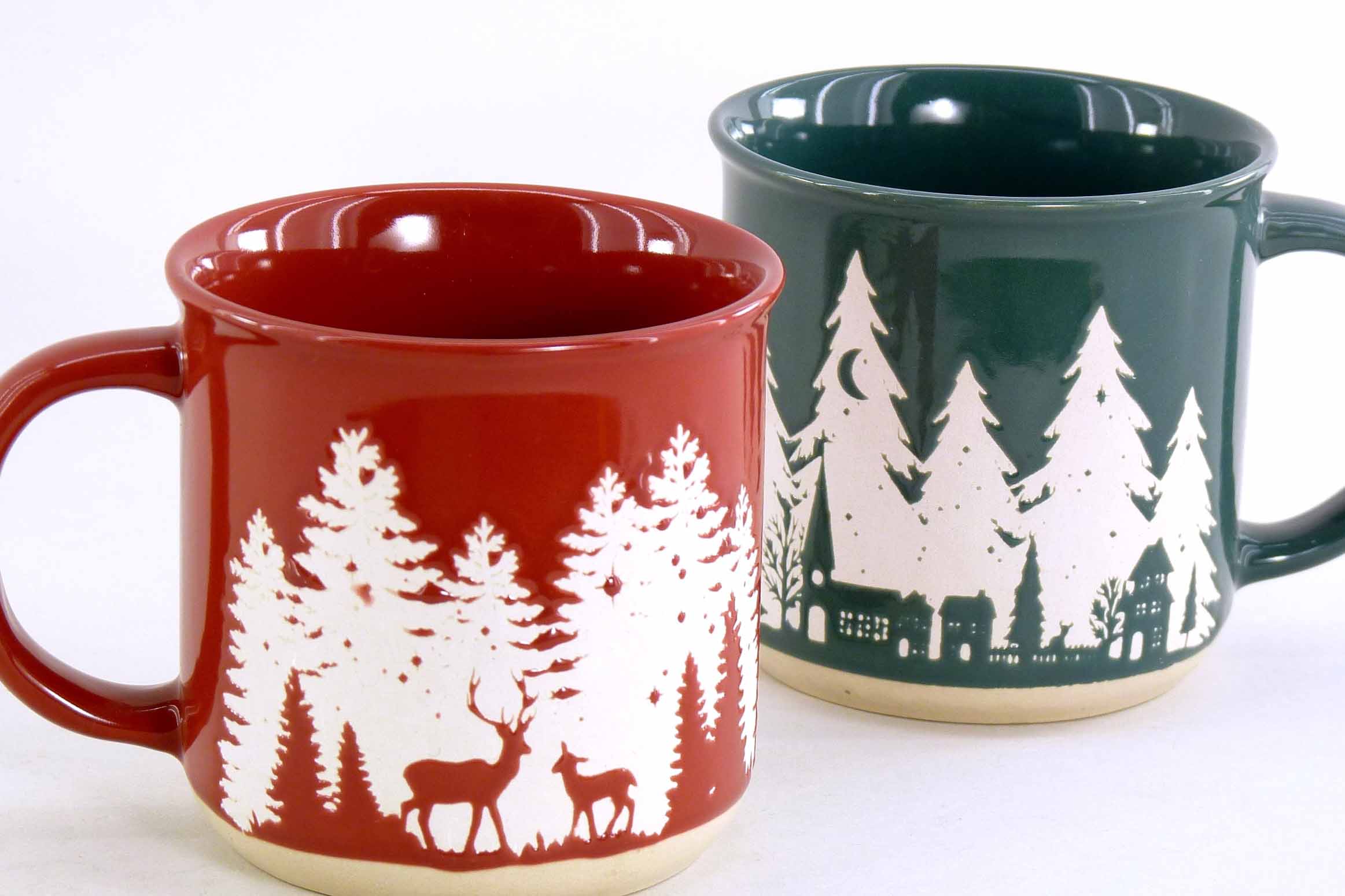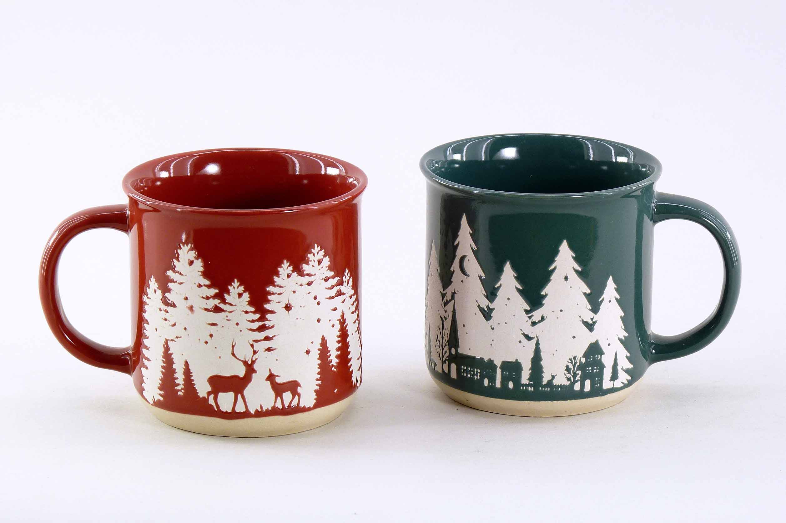 Steingut-Tasse ''Winterwald'' rot-grün-weiß sort. ø/H9cm