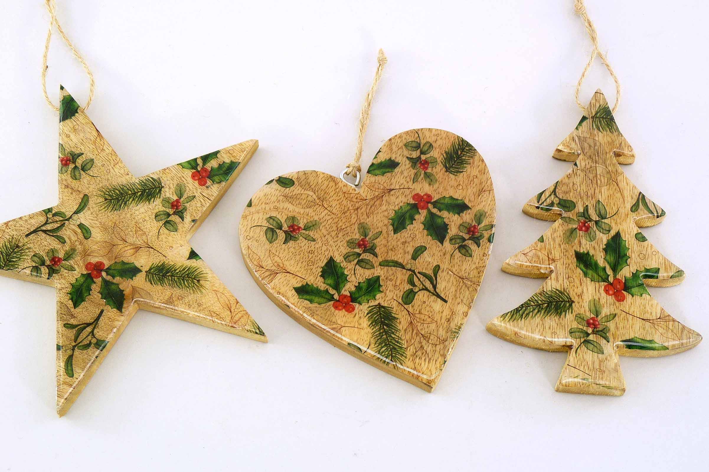 Mangoholz-Stern/Herz/Baum ''Reisig''hgd. natur-grün sort. ø12-16cm