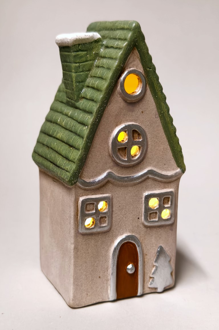 Keramik-Haus +LED grau-silber-grün 8,5x7 H18cm