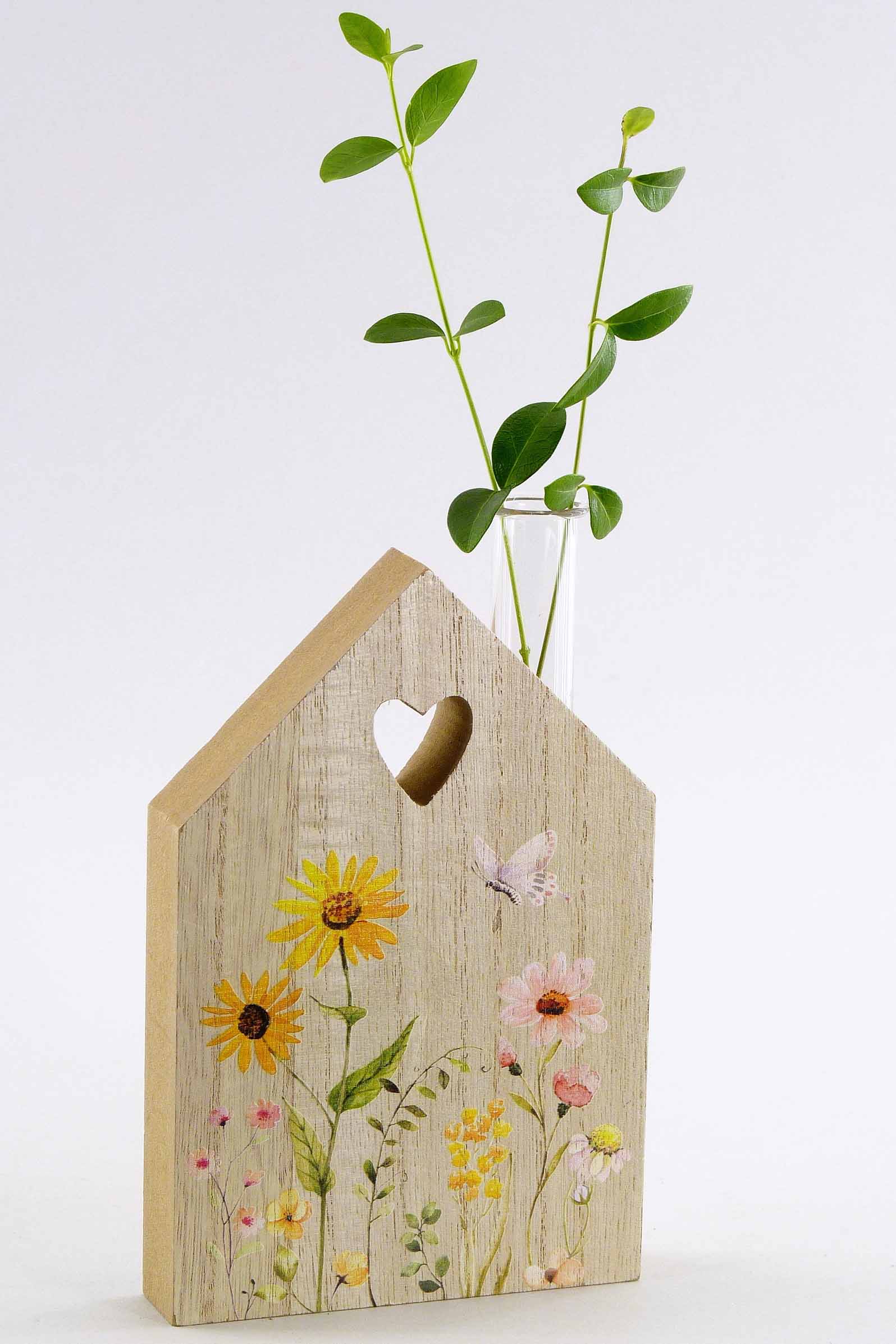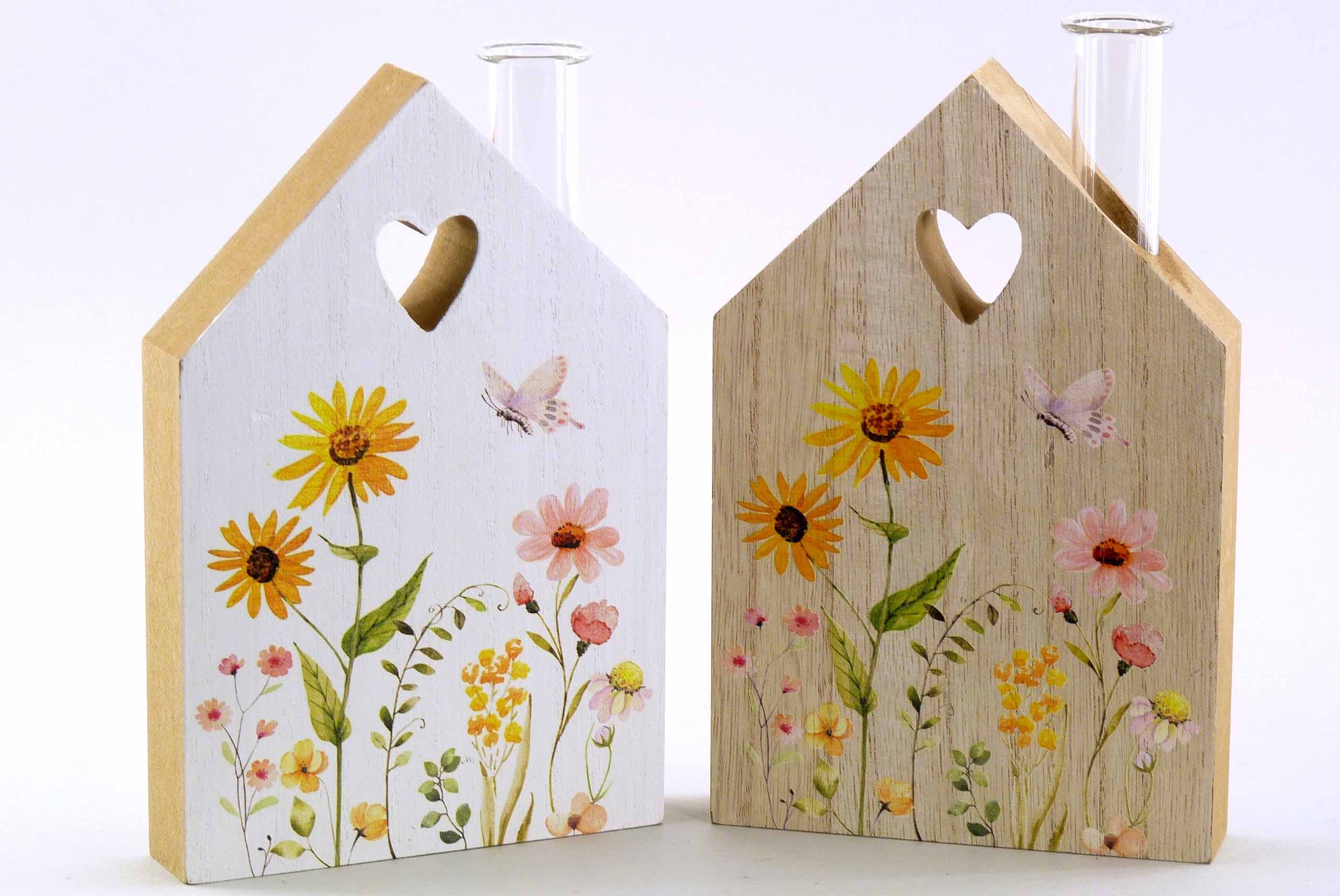 Holz-Haus ''Blumenwiese'' +Glasvase natur/weiß-coloriert sort. H19 B11cm